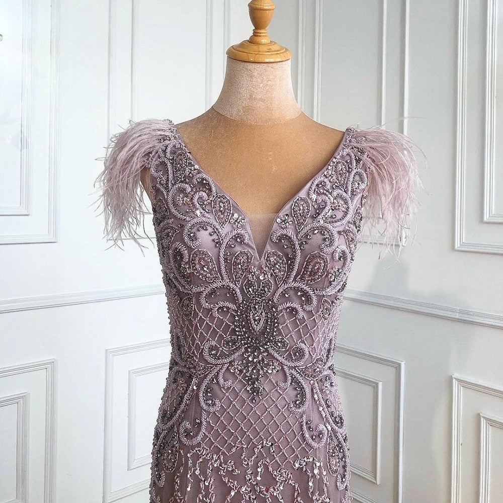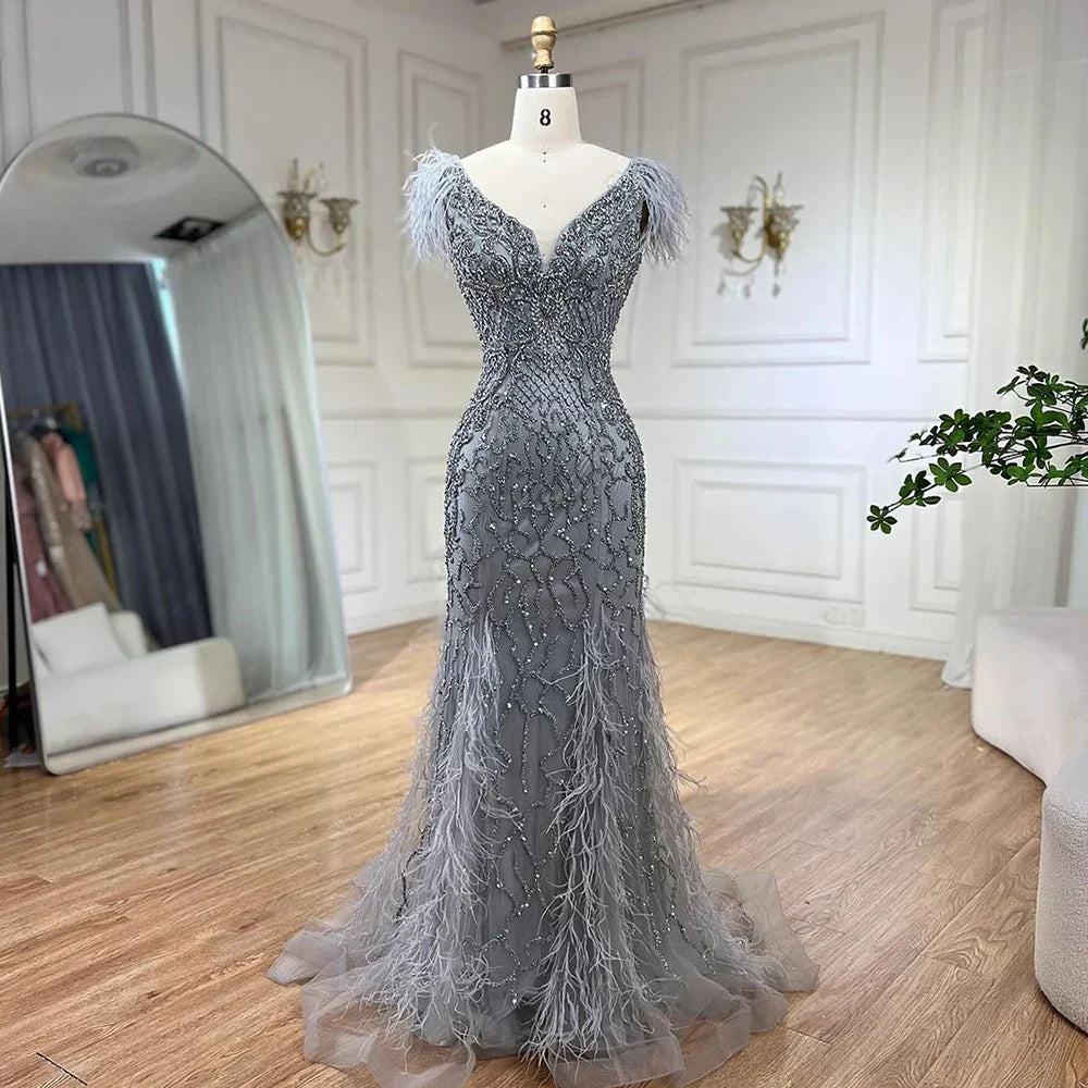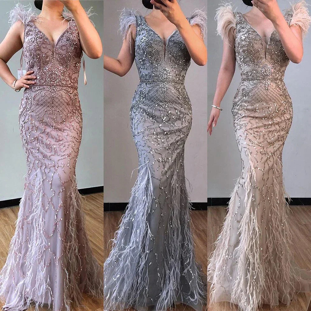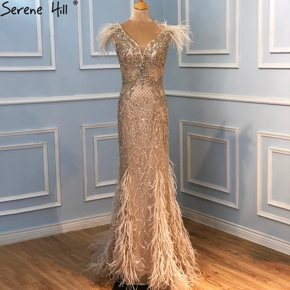 Champagne Luxury V-Neck Sexy Mermaid Evening Dresses 2025 Diamond Feathers Sleeveless Formal Dress LA70350