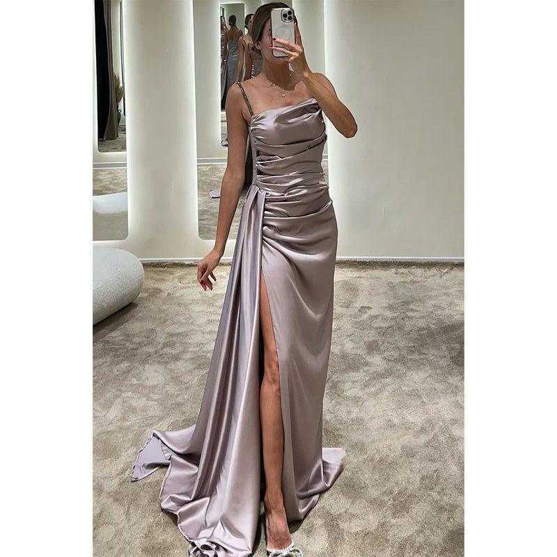 Chic & Modern Satin Pleats Spaghetti Straps Slit Simple Long Prom Dress