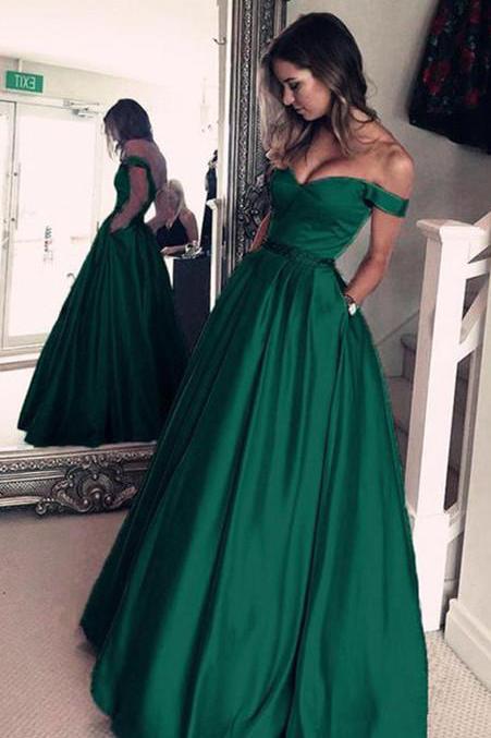 Chic Off-the-Shoulder Evening Party Gowns Green Long Prom Dresses