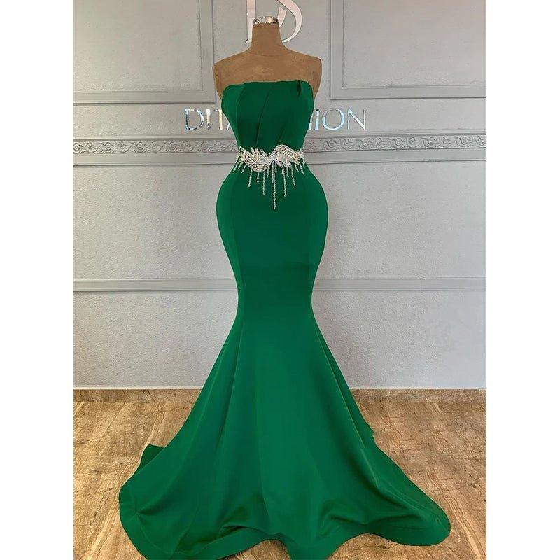 Chic Strapless Green Satin Pleats Mermaid Long Formal Evening Gowns