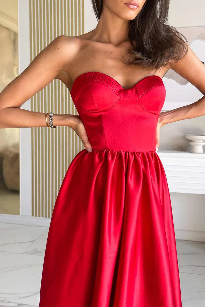 Attend your next party in style with our stunning Cocktail Dress! This long party dress features a sweetheart neckline and strapless design that accentuates your figure. Made from high-quality satin material. the A-line silhouette flatters any body type. Perfect for prom or homecoming. this dress will make you the center of attention!