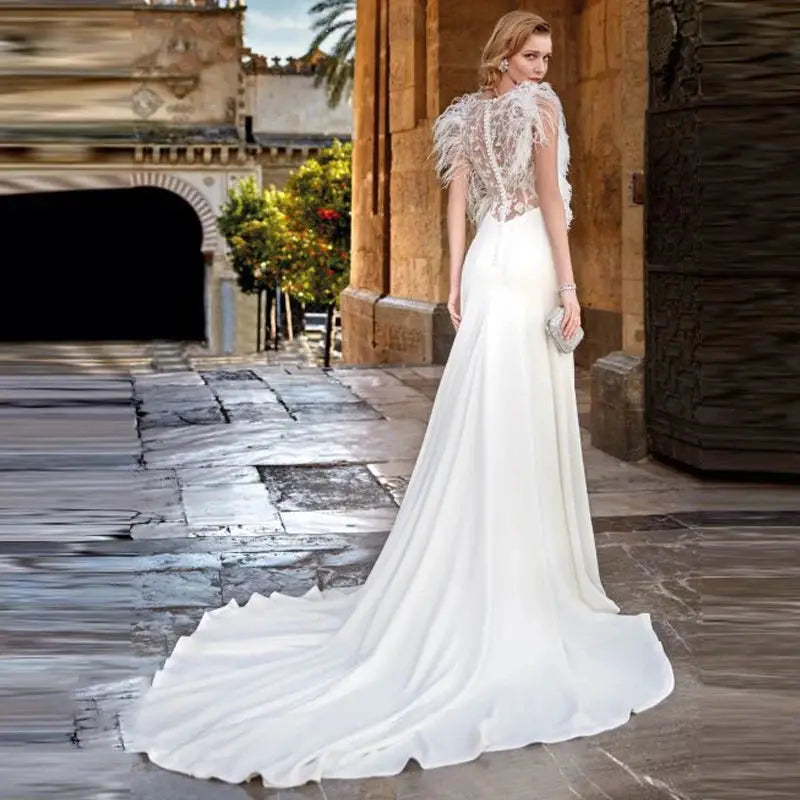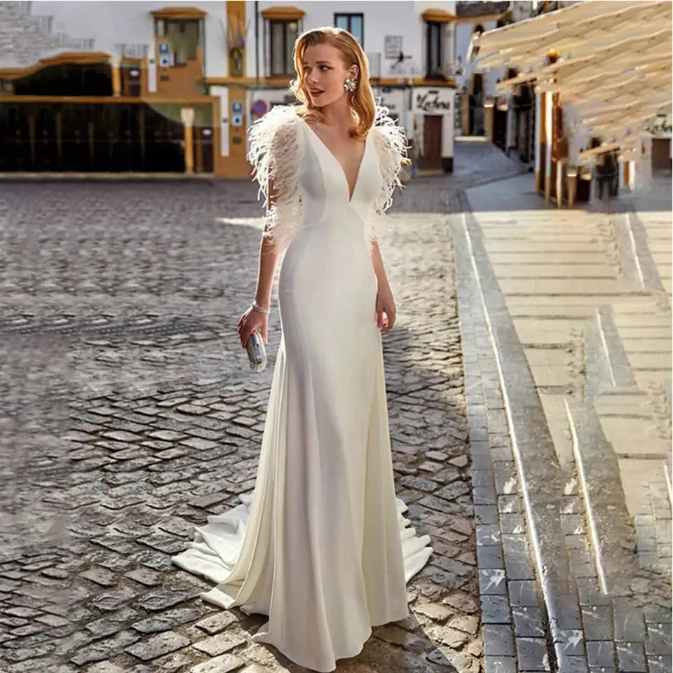 Custom Made Feather Mermaid Elegant V-neck Sleeveless Stain Wedding Dress Vestido De Novia Bridal Gown For Women