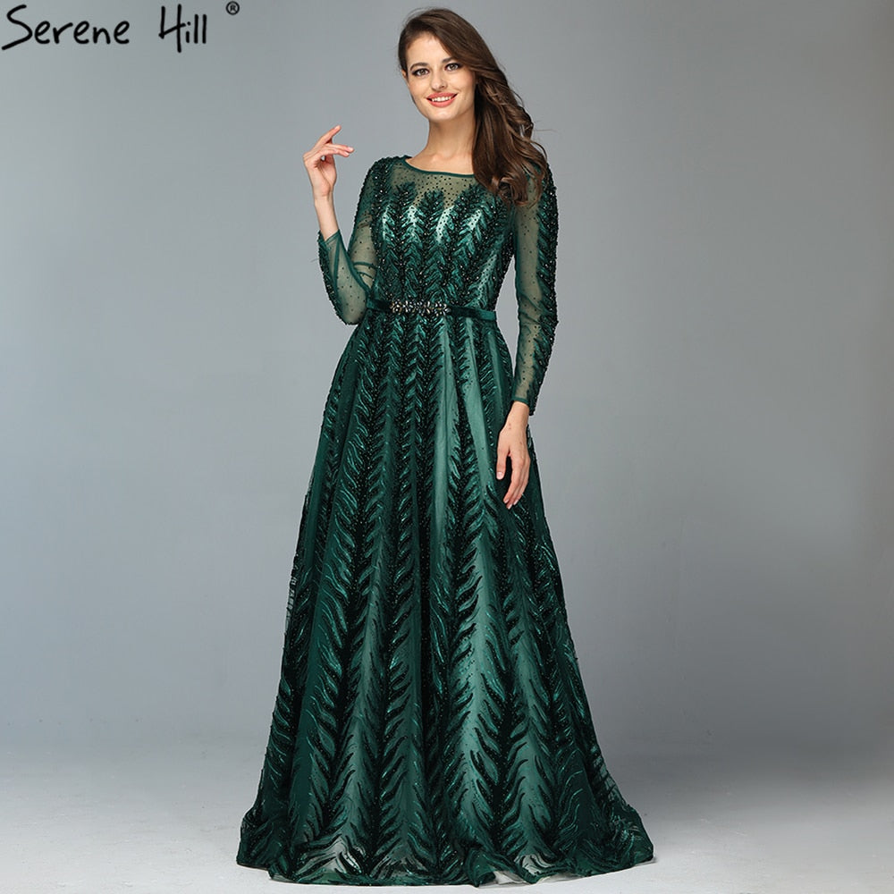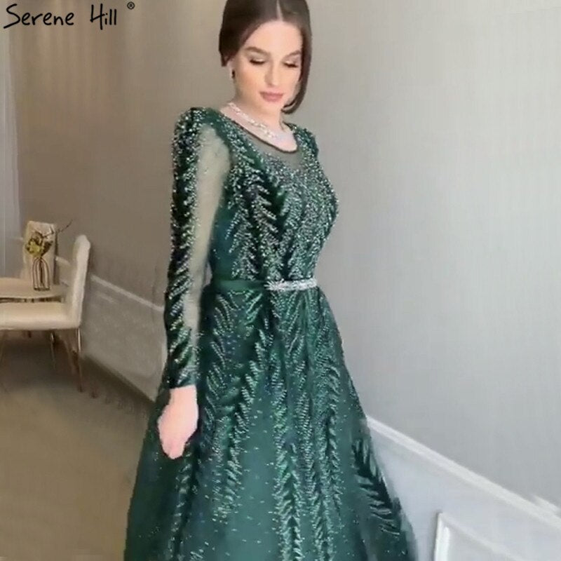 Dubai Design Green Long Sleeves Evening Dresses 2025 O-Neck Beading Sequined A-Line Formal Dress LA70040