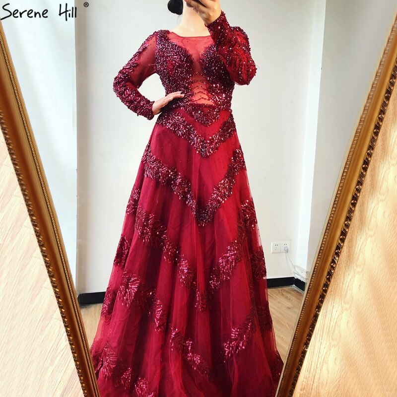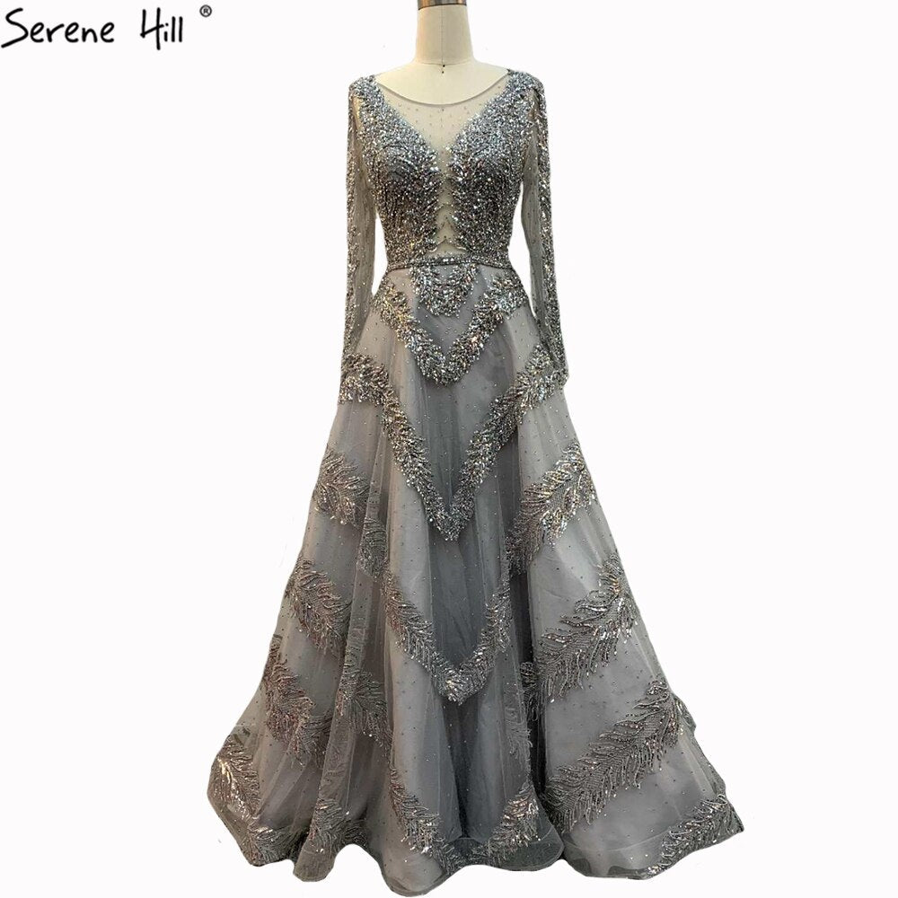 Dubai Grey A-Line Luxury Sexy Evening Dresses 2025 Long Sleeves Diamond Beading Formal Dress LA70618
