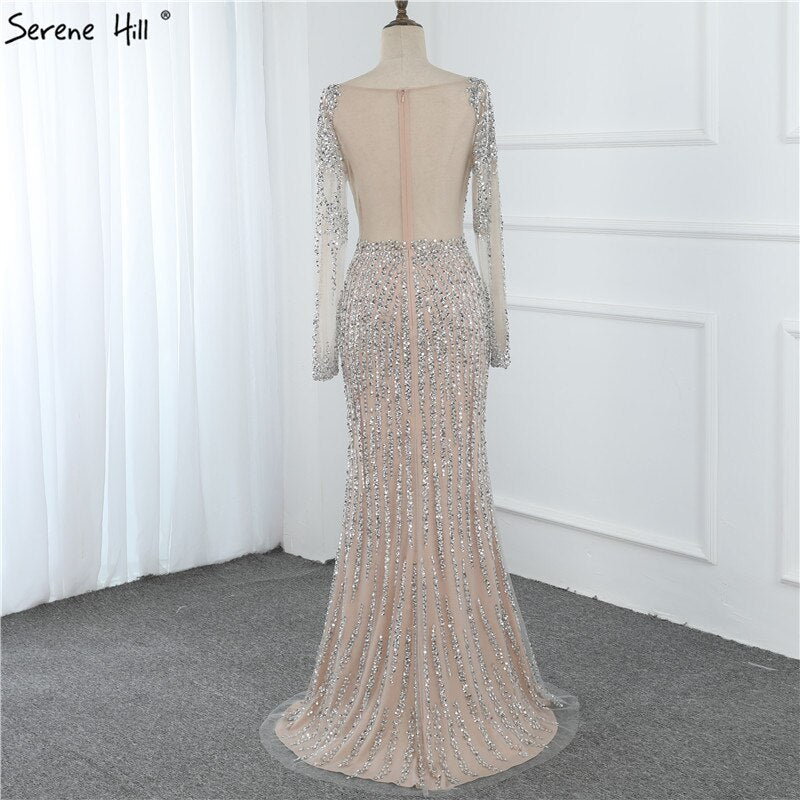 Dubai Silver O-Neck Mermaid Evening Dresses Design 2025 Luxury Long Sleeves Sequins Beading Evening Gown LA70249