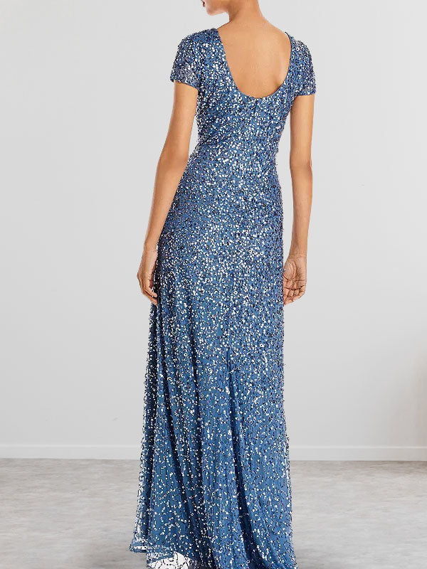 Dusty Blue Sequins Sheath Scoop Long Mother of the Bride Dress
