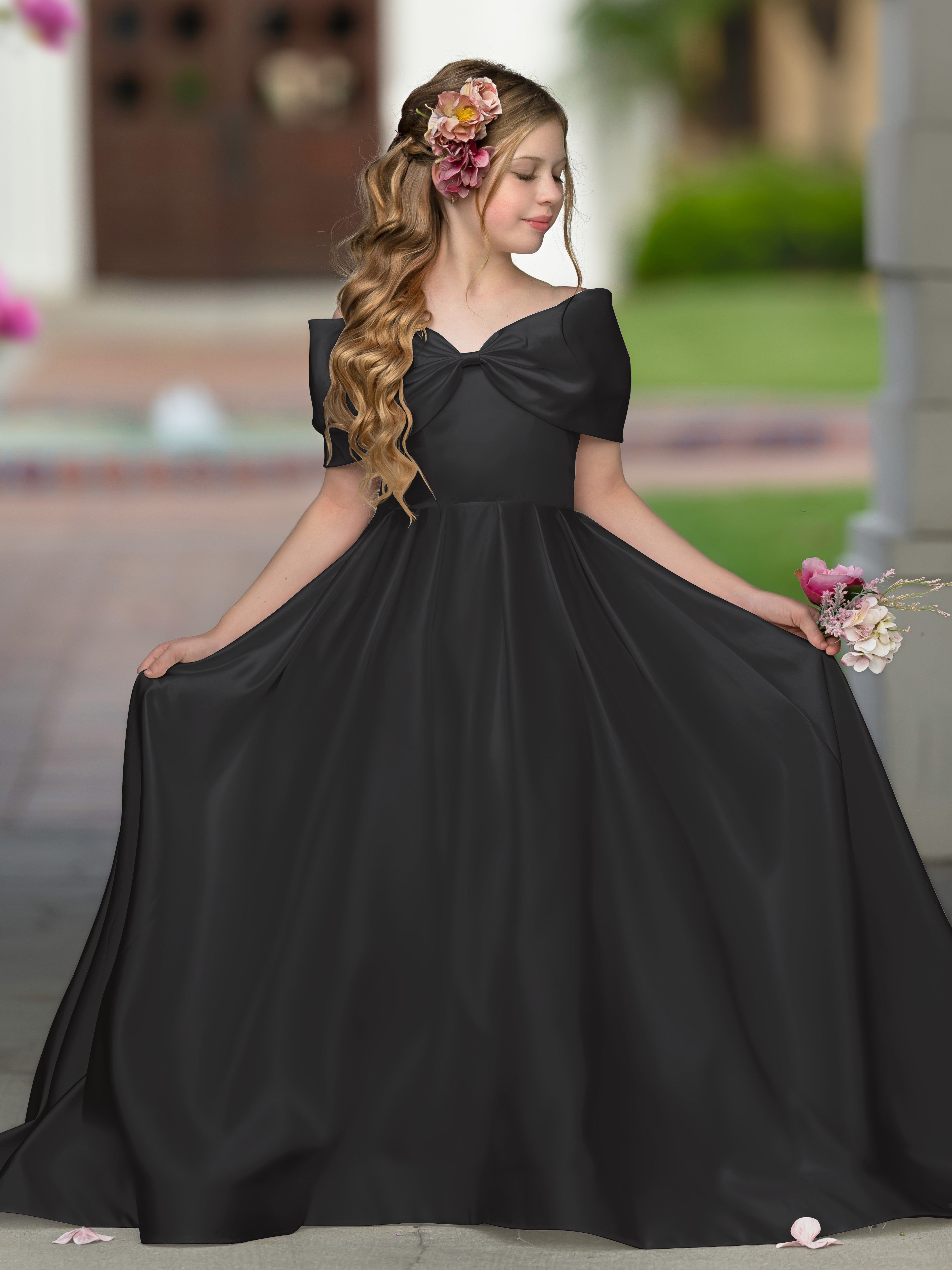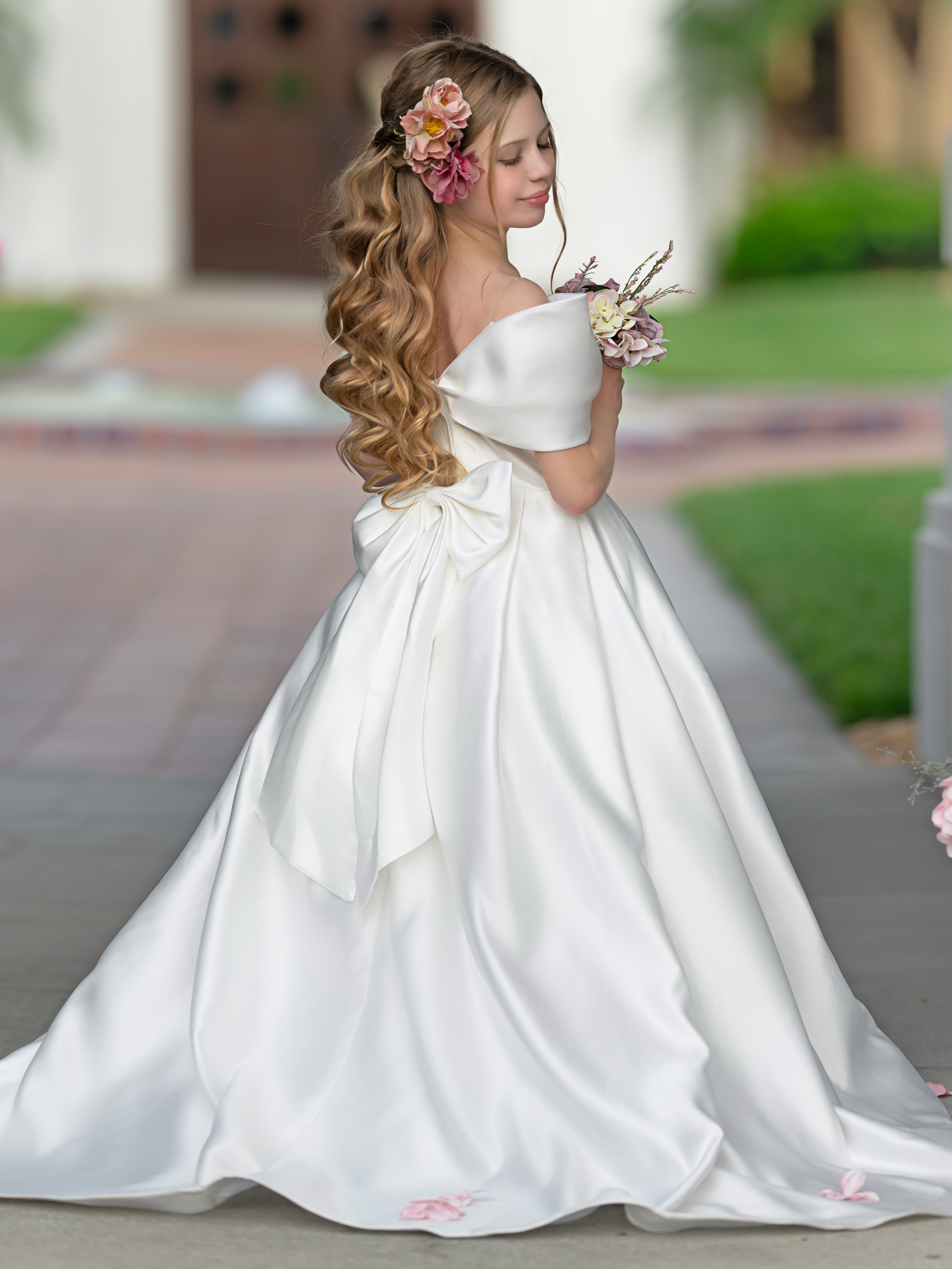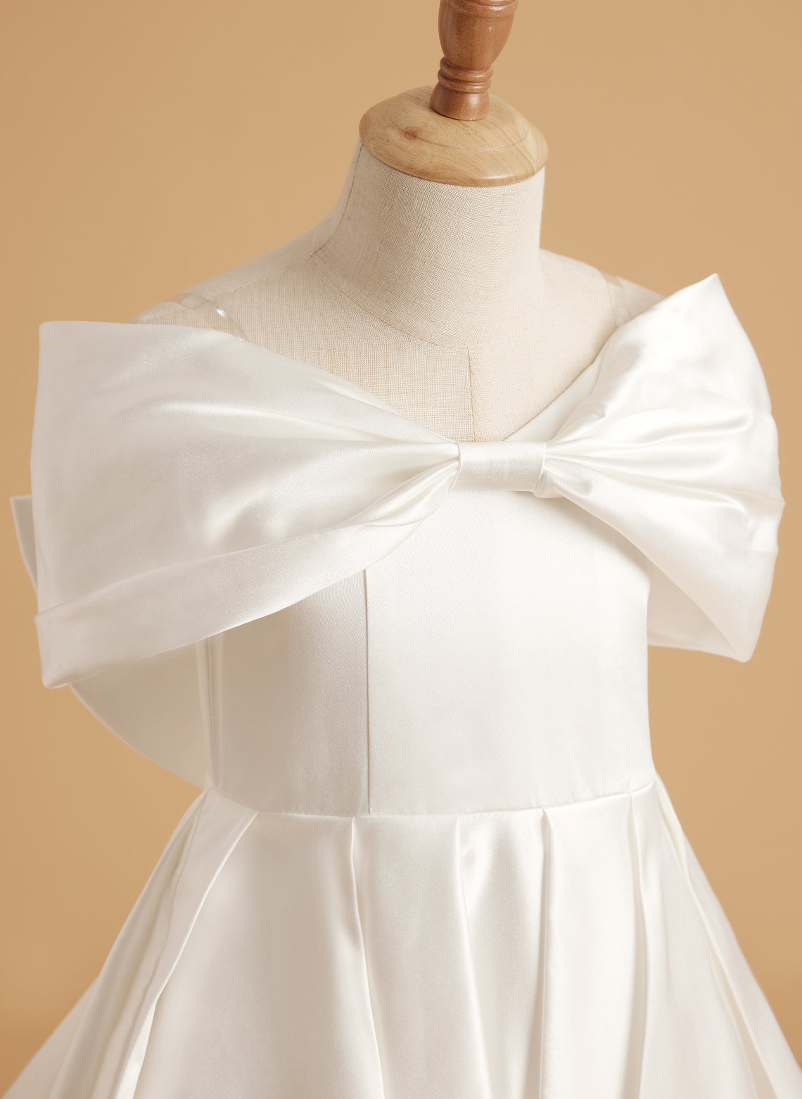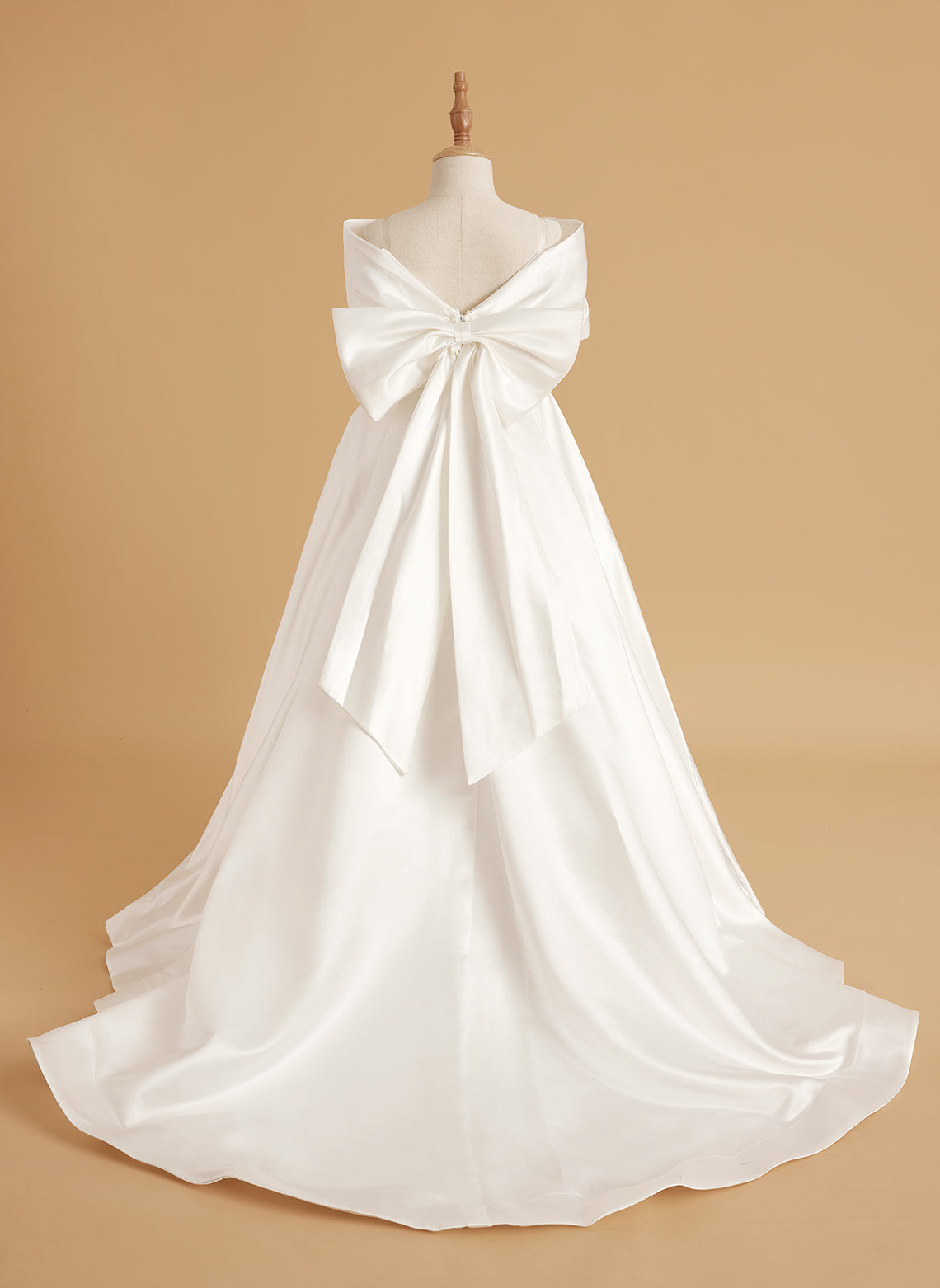 Elegant Ivory Satin Princess Ball Gown with Sweep Train and Bow for Flower Girls