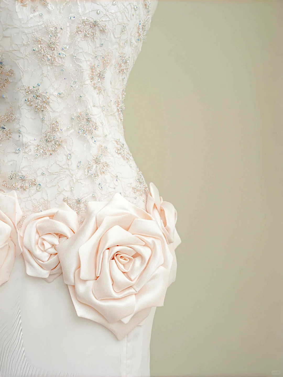 Elegant Light Pink Satin Lace Sequin Beaded Evening Dress Slit Mermaid Prom Dress Y8672