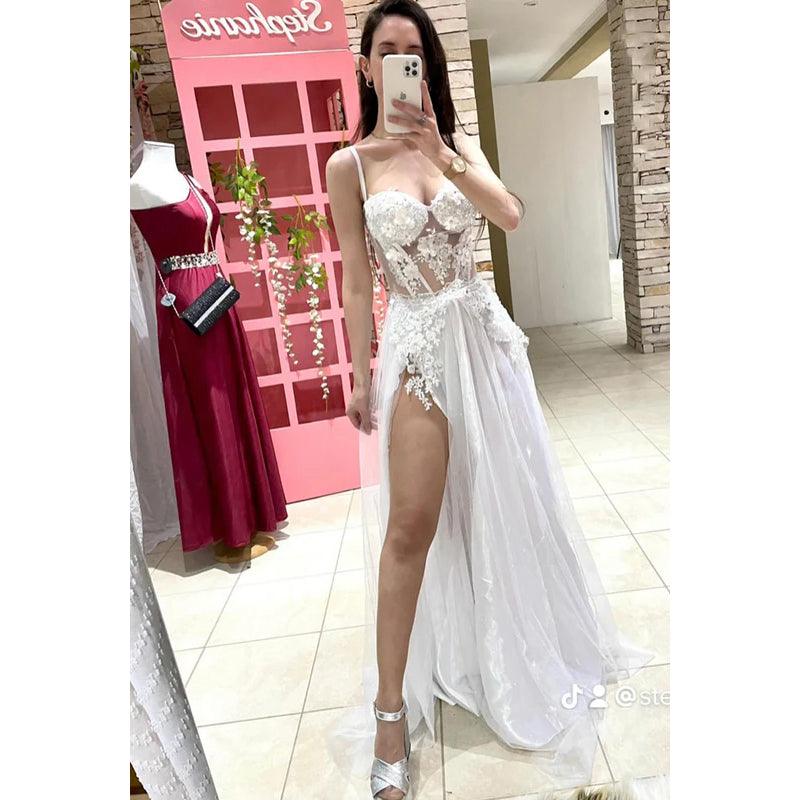 Elegant & Luxurious Spaghetti Straps A-line Side Slit Applique Party Prom Dress