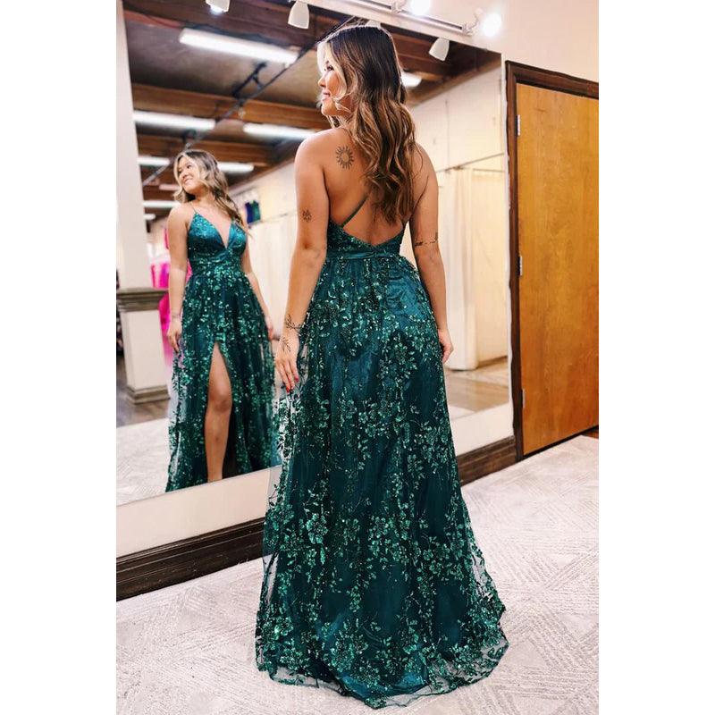 Elegant & Luxurious V-neck Spaghetti Straps A-Line Slit Squins Formal Party Prom Dress