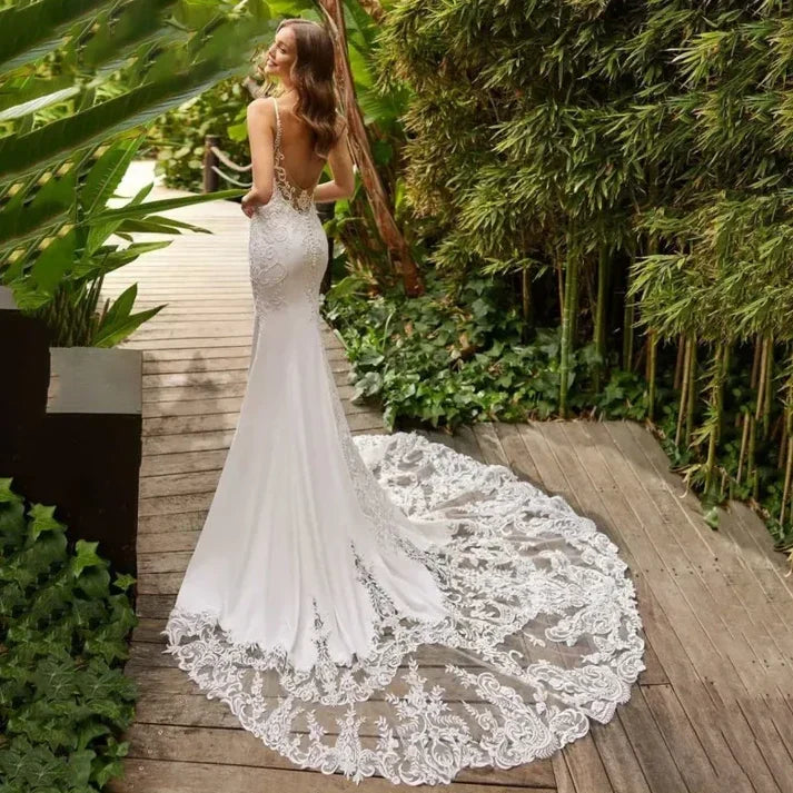 Make your special day even more special with this elegant ivory mermaid lace wedding dress. With a striking neckline and bohemian-style skirt. this exquisitely designed beach wedding dress is sure to turn heads. Add a romantic touch to your ceremony with WD288.Item DetailFabric:LaceSilhouette:MermaidSleeves:SleevelessColor:As Picture.Custom...