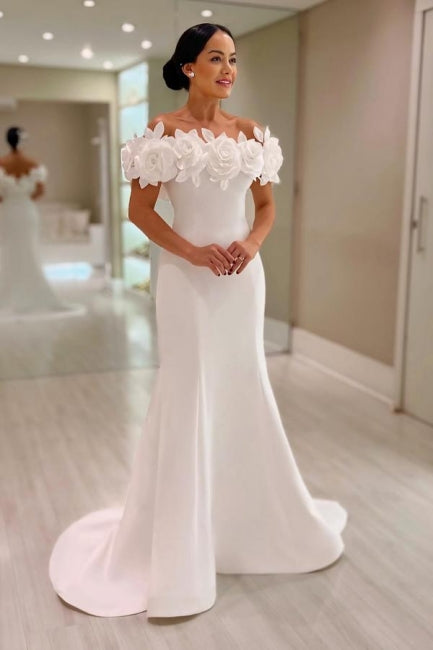 This Fabulous Mermaid Satin Off-The-Shoulder Sleeveless White Wedding Dress is the epitome of elegance and style. The mermaid silhouette accentuates your figure. while the off-the-shoulder neckline adds a touch of romance. Made with luxurious satin. this dress will make you feel like a true mermaid princess on your special day.