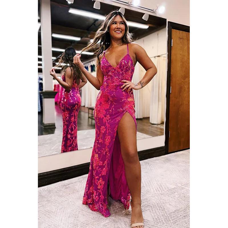 Fuchsia Sequins Lace V Neck Mermaid Long Prom Dress