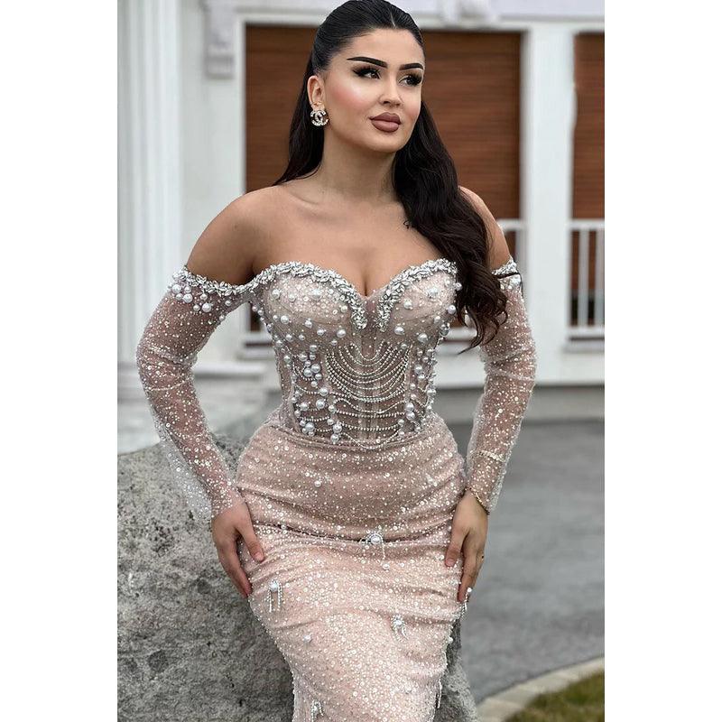 Glamorous & Dramatic Trumpet/Mermaid Off-Shoudler Long Sleeves Beaded Prom Dress