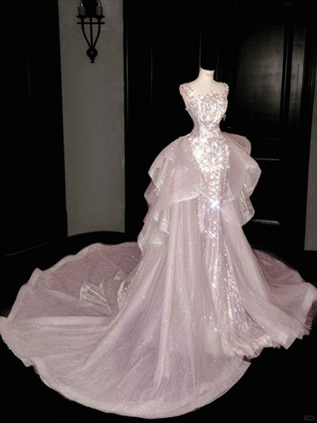 Glamorous Lavender Tulle Beaded Mermaid Prom Dress Formal Evening Dress Y8669