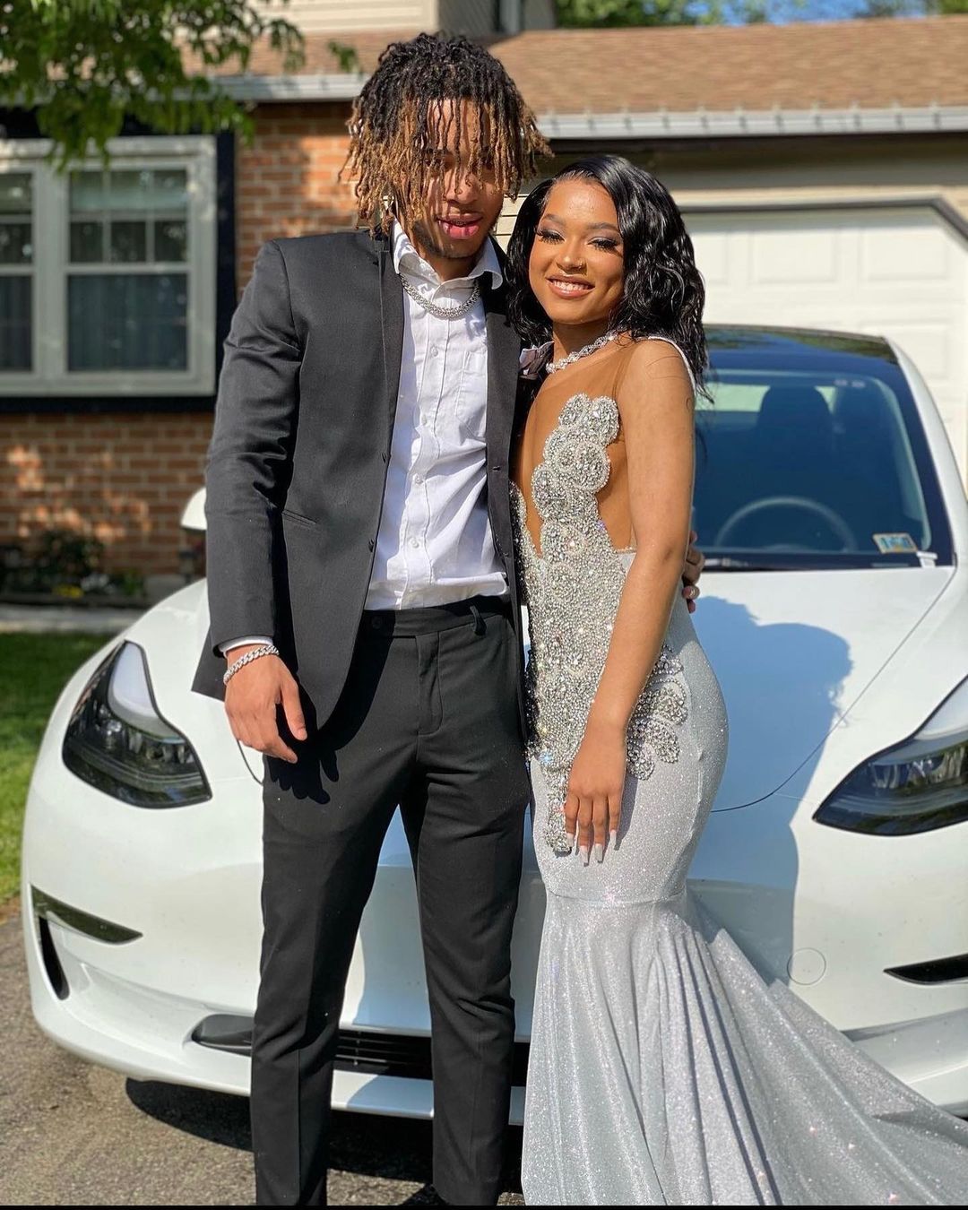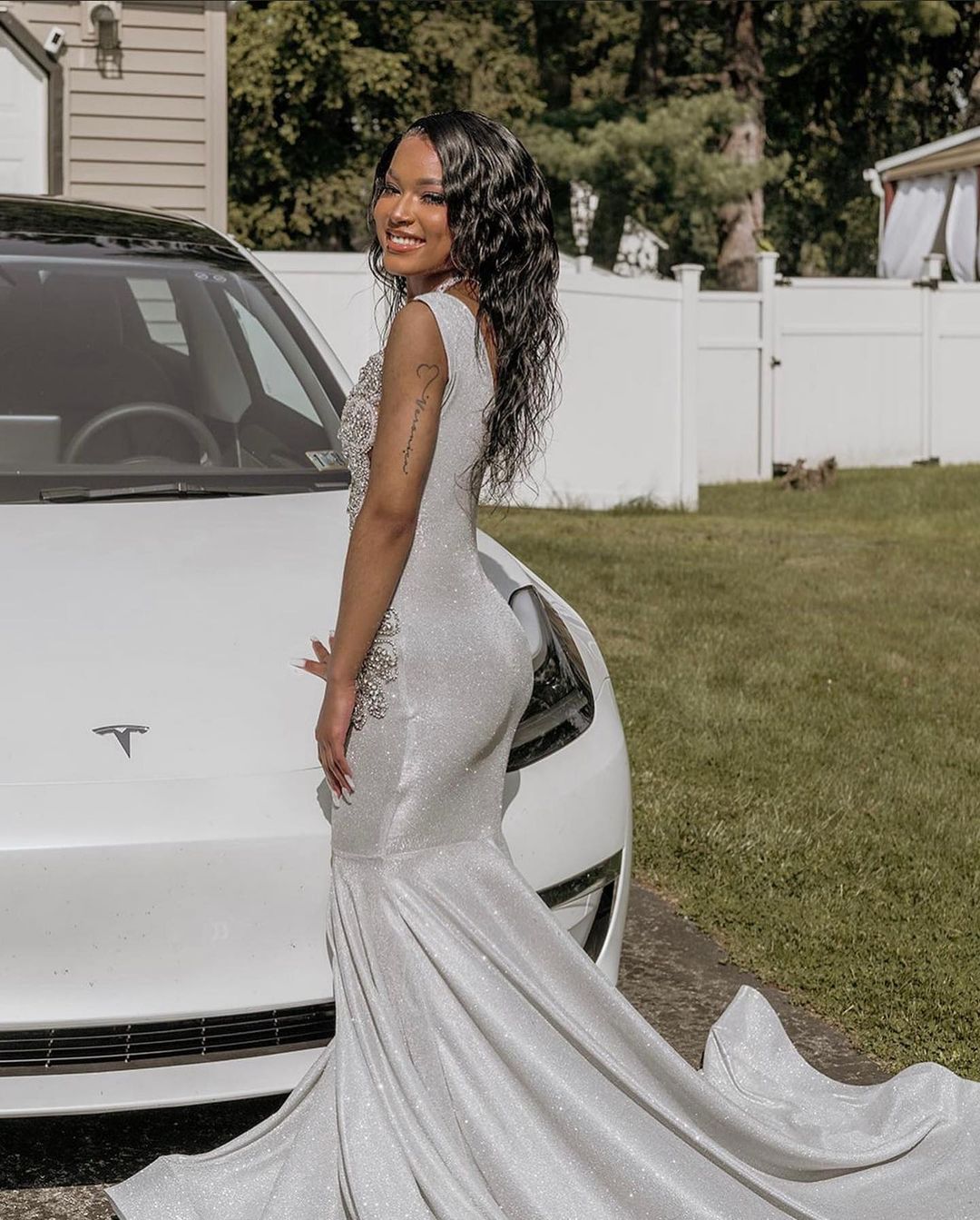 A unique piece perfect for the special occasions. this glamorous silver-colored prom dress features a beautiful mermaid silhouette with a sequined bodice and lace detailing. Its sleeveless design ensures it is comfortable to wear while also providing an elegant and sophisticated touch.