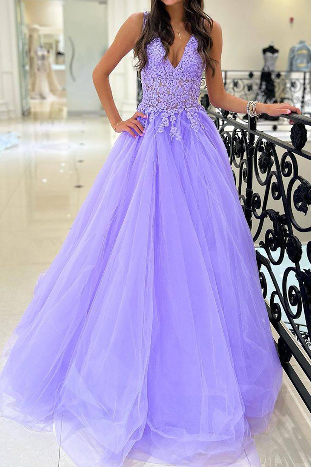 Gorgeous A Line V Neck Purple Long Prom Dress with Appliques