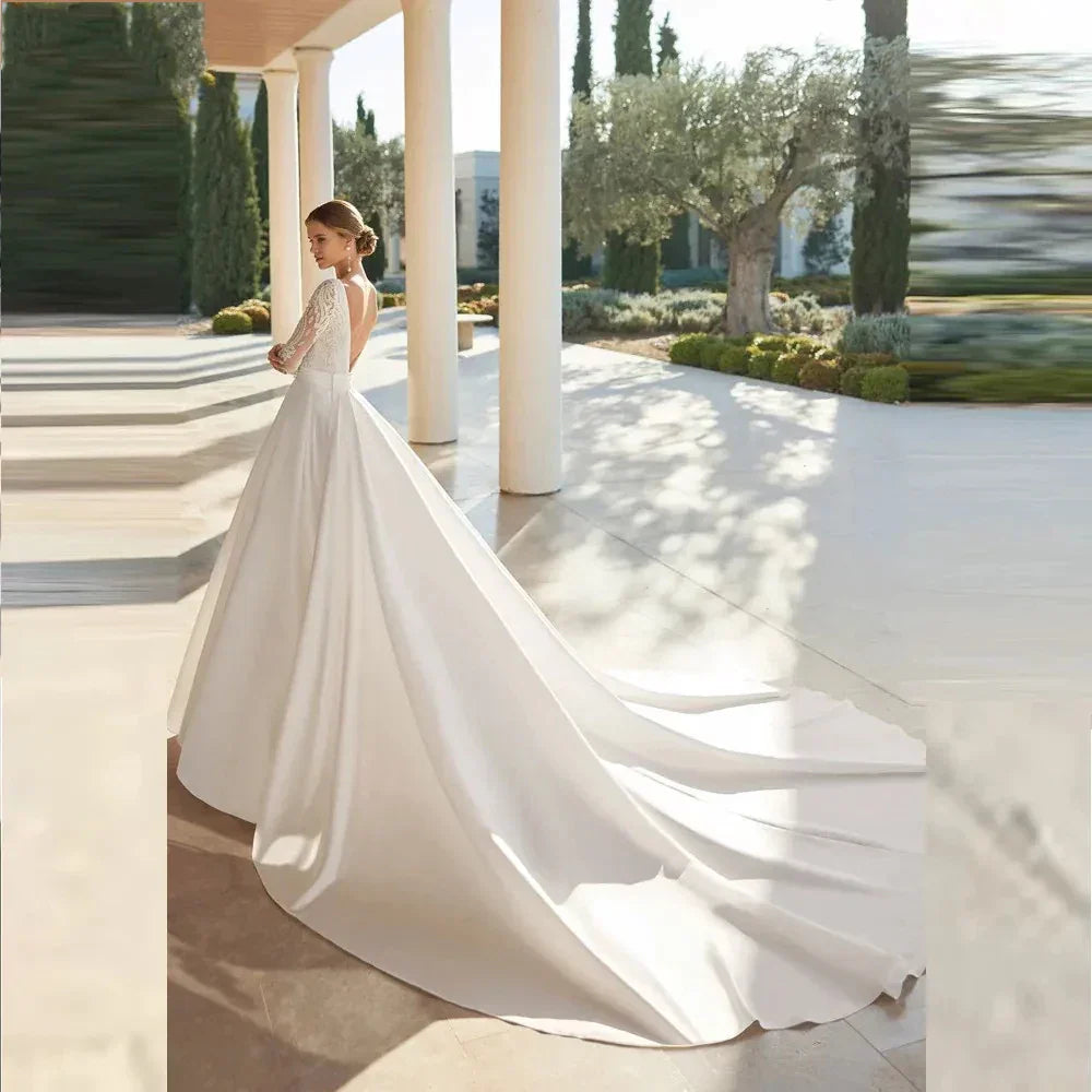 Gorgeous Satin Fascinating Wedding Dresses Beautiful Long Sleeve Simple Elegant Bridal Gowns Sexy Exquisite Lace Appliqued Robe