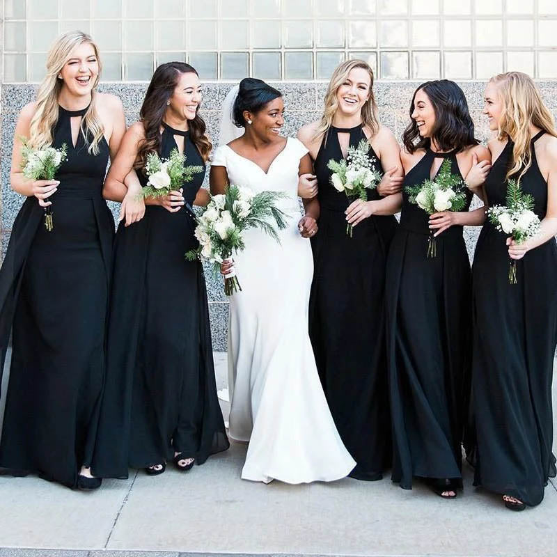 1.Fabric:Chiffon 2.Silhouette:A-line 3.Neckline:Halter 4.Embellishment:None 5.Waistline:Natural 6.Sleeve:Sleeveless 7.Back Styles:Zipper 8.Hem-length:Floor-length 9.Boned: Yes 10.Fully Lined: Yes 11.Built-in Bra: Yes 12.Picture Color:Black(For custom colors. please check our Color Chart and leave a note)
