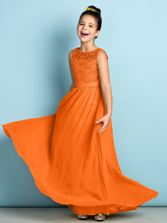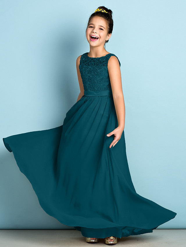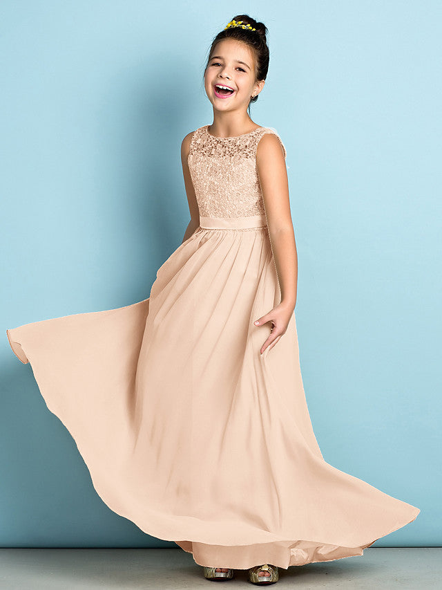 Long A-Line Scoop Neck Flower Girl Dresses Chiffon Lace Junior Bridesmaid Dress