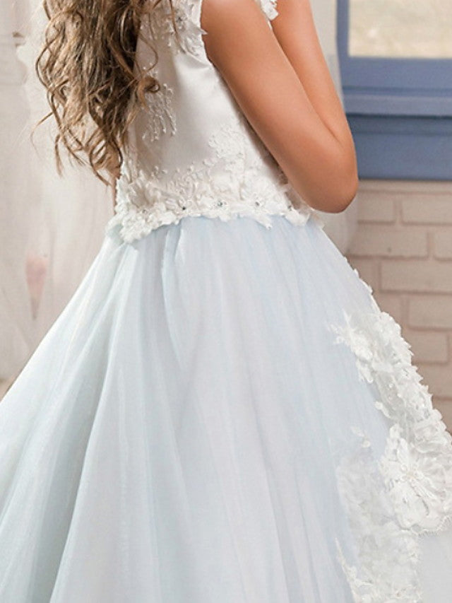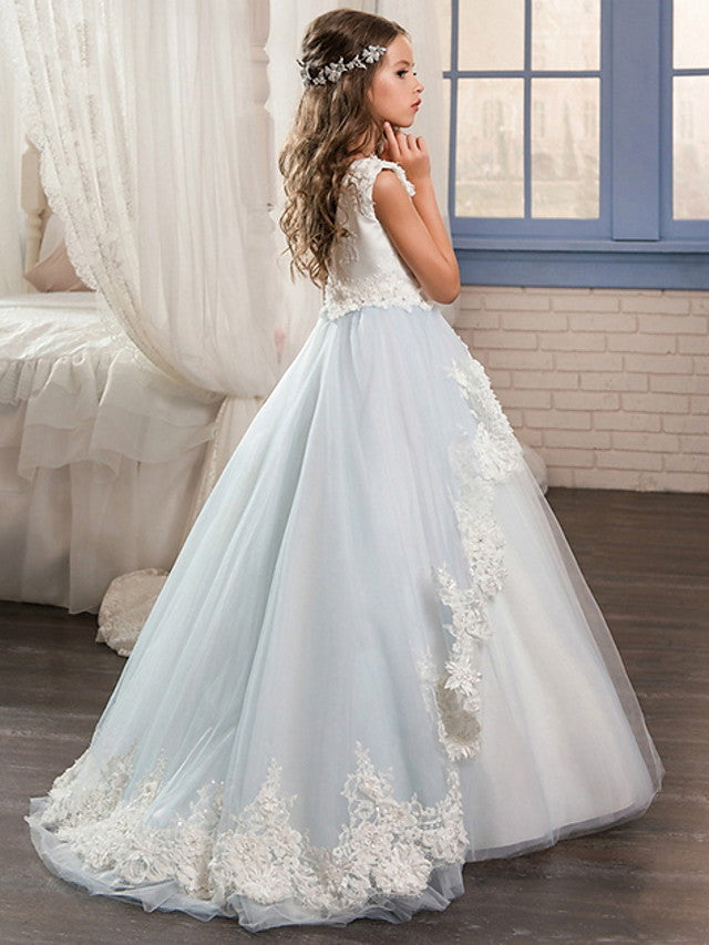 Long Ball Gown Jewel Neck Wedding Event Party Flower Girl Dresses With Lace Appliques