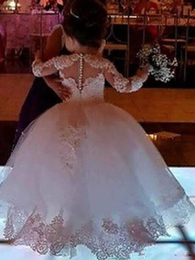Long Ball Gown Lace Jewel Neck Wedding Flower Girl Dresses with Sleeves