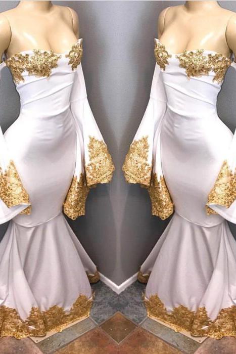 Long Sleevess Formal Dresses with gold appliques, mermaid Evening Party Gowns