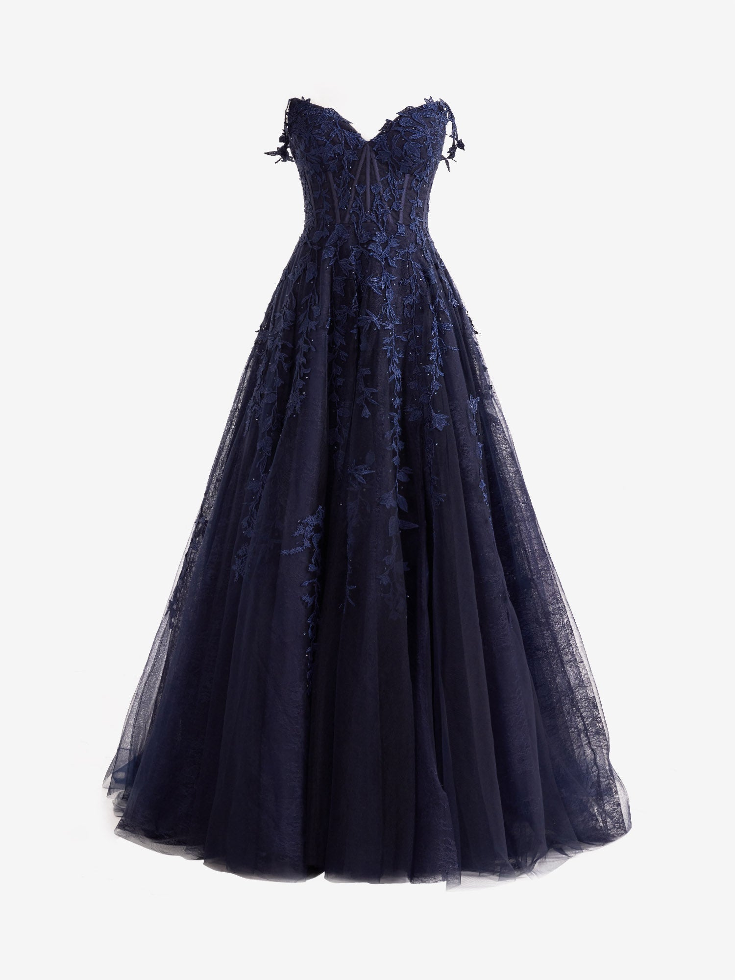 Mariana is where classic elegance meets contemporary flair. Expertly crafted in a universally flattering A-line style. the dress gracefully cascades to the floor. punctuated by a sultry slit that offers just a glimpse of allure. The sweetheart neckline adds a touch of timeless romance. complemented by versatile straps that drape off-the-shoulder or sit elegantly upon them. Each swish reveals the intricate lace and beaded tulle fabric. shimmering with every step. With a corset bodice that cinches and enhances. Mariana isn't just a dress—it's an experience. Choose from a rich palette of colors and step into a world where every moment is your spotlight.