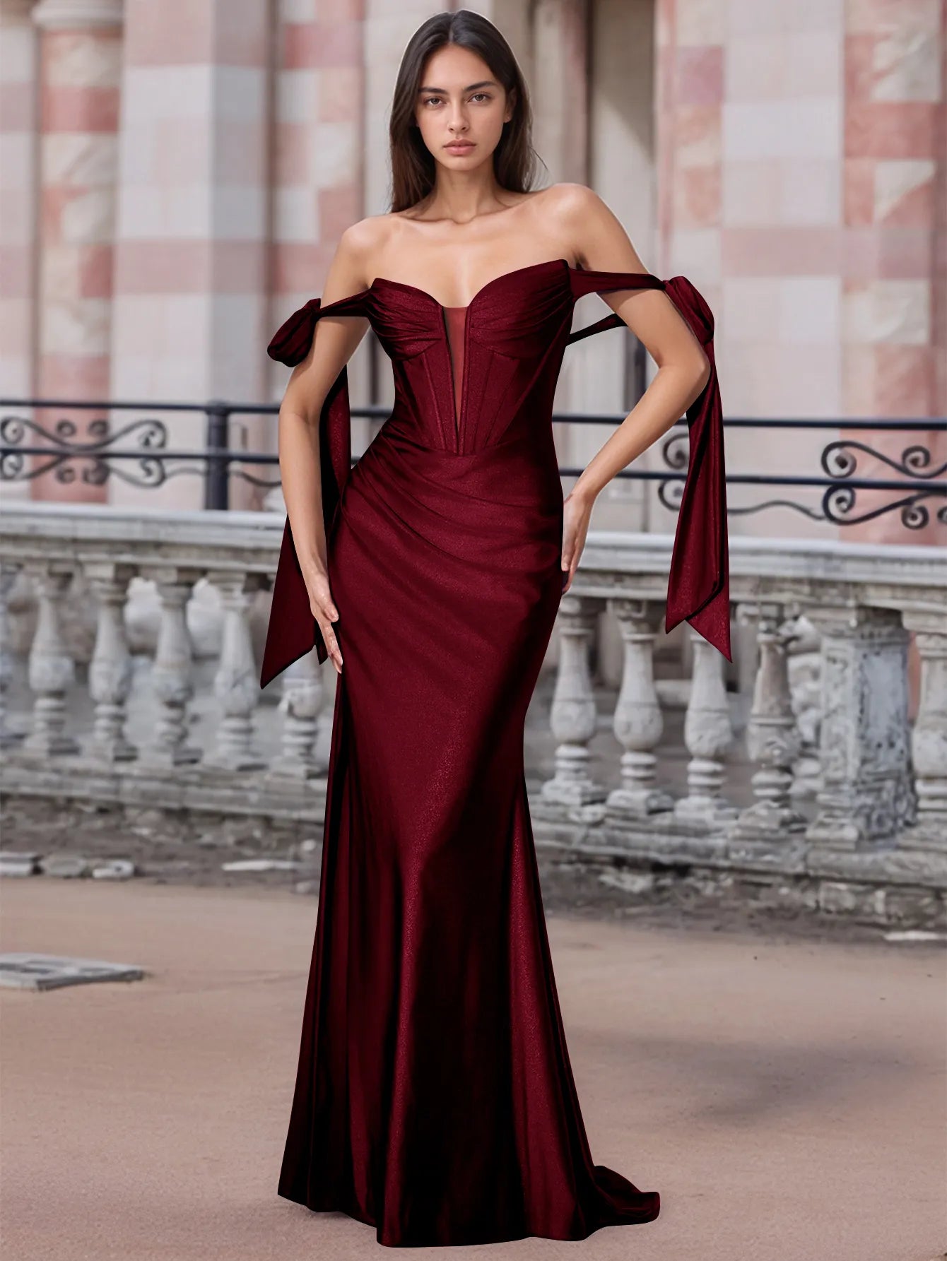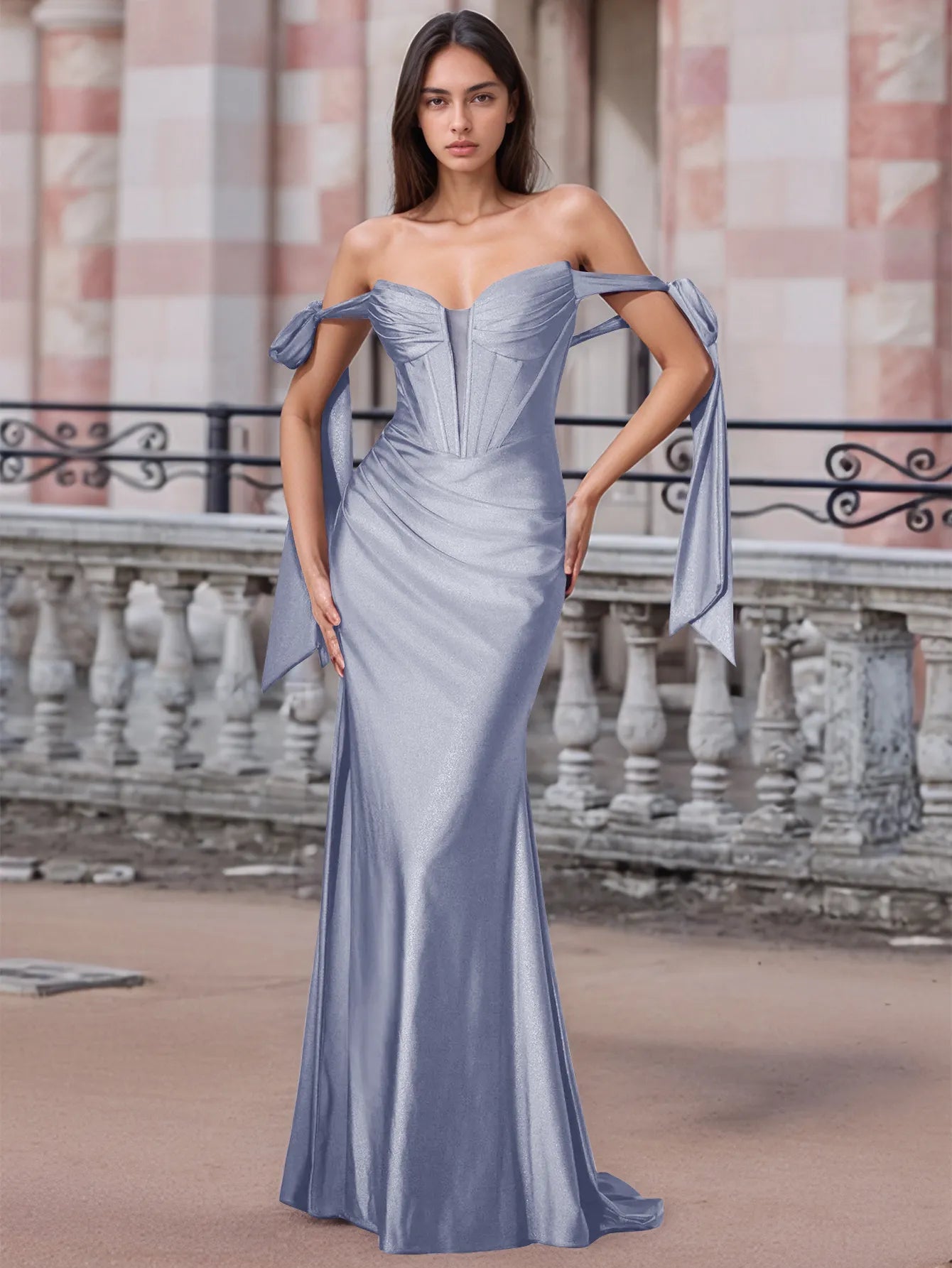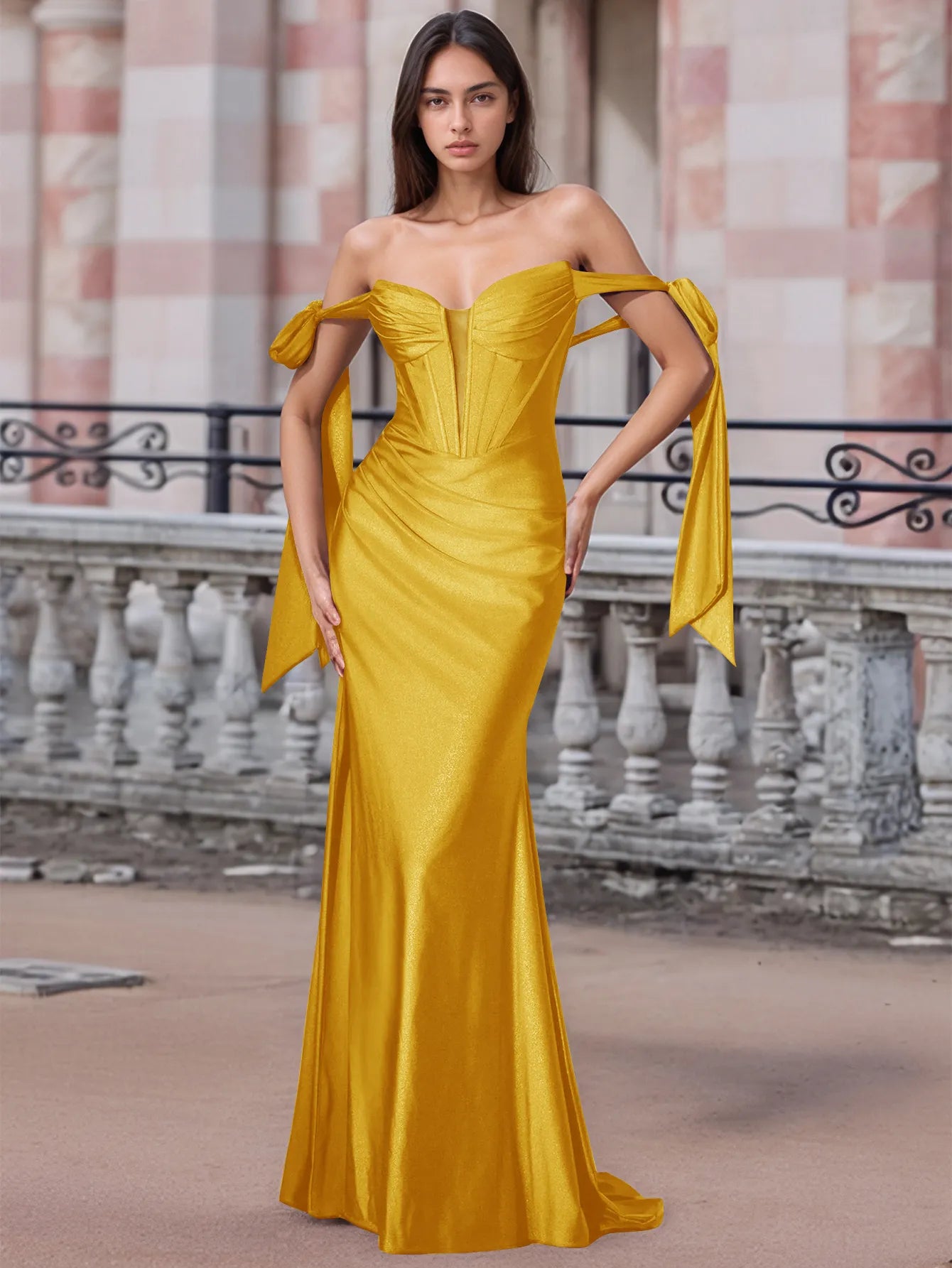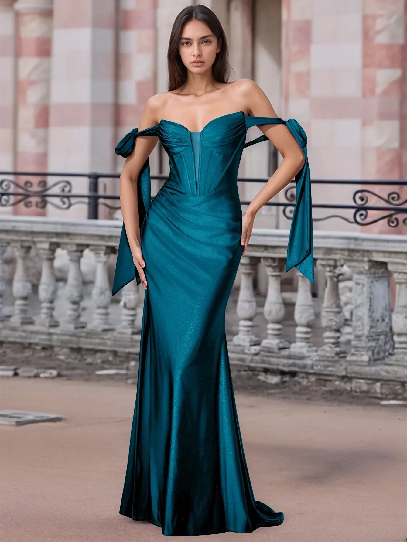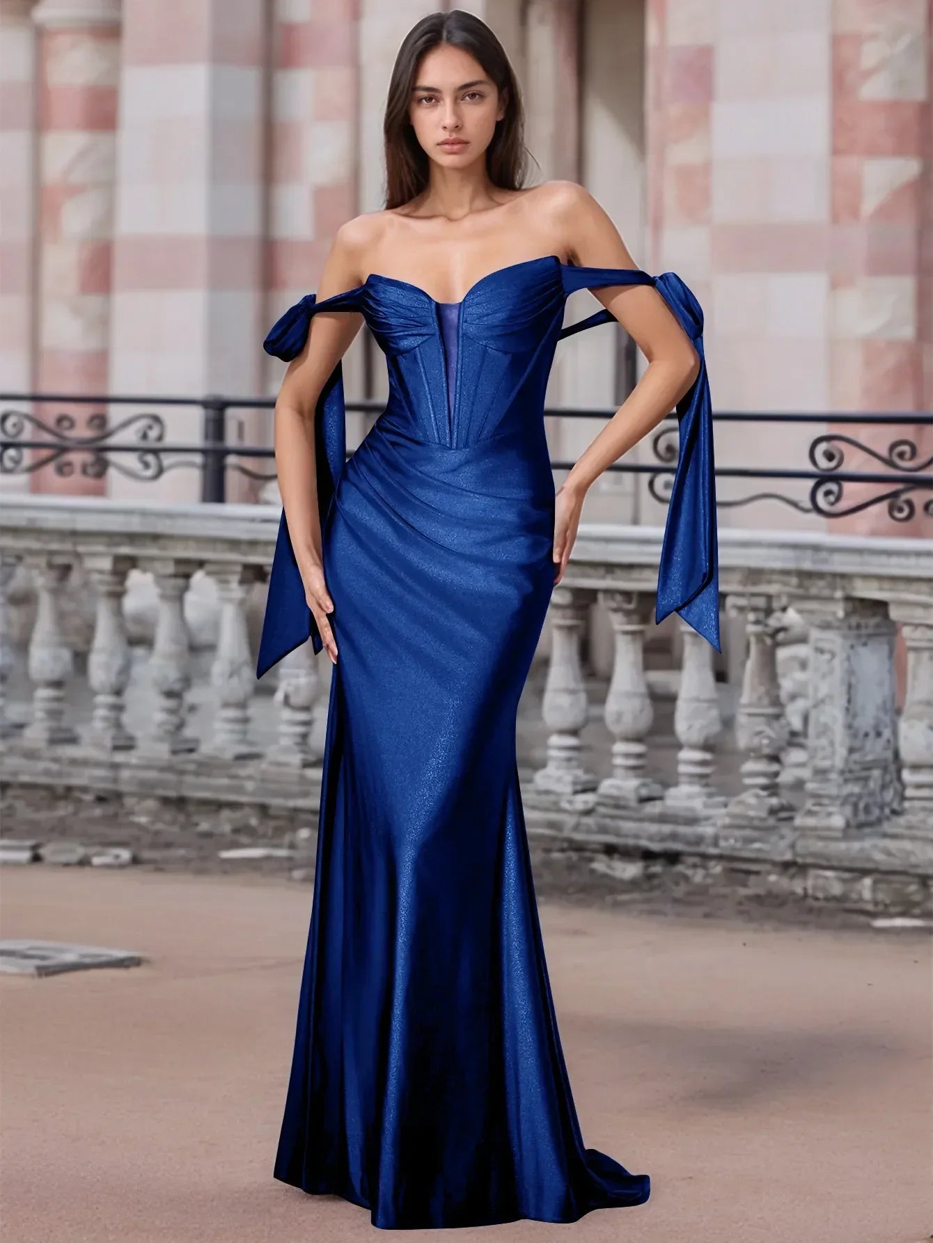 Off Shoulder Lace Up Bow Trumpet Prom Dress