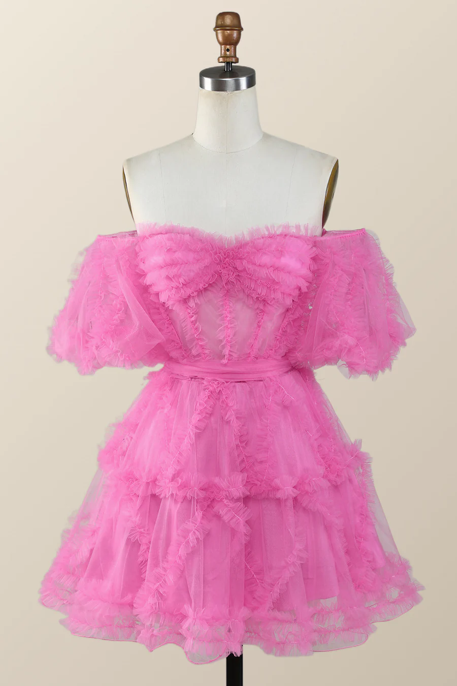 Off the Shoulder Hot Pink Ruffles Short A-line Homecoming Dress Y2783