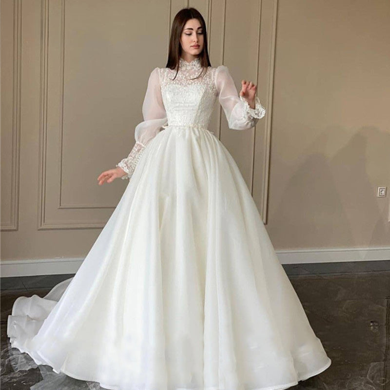 Organza A Line Appliques Lace Wedding Dress Puff Long Sleeves High Neck Bridal Gowns Robe De Mariage Custom TG001
