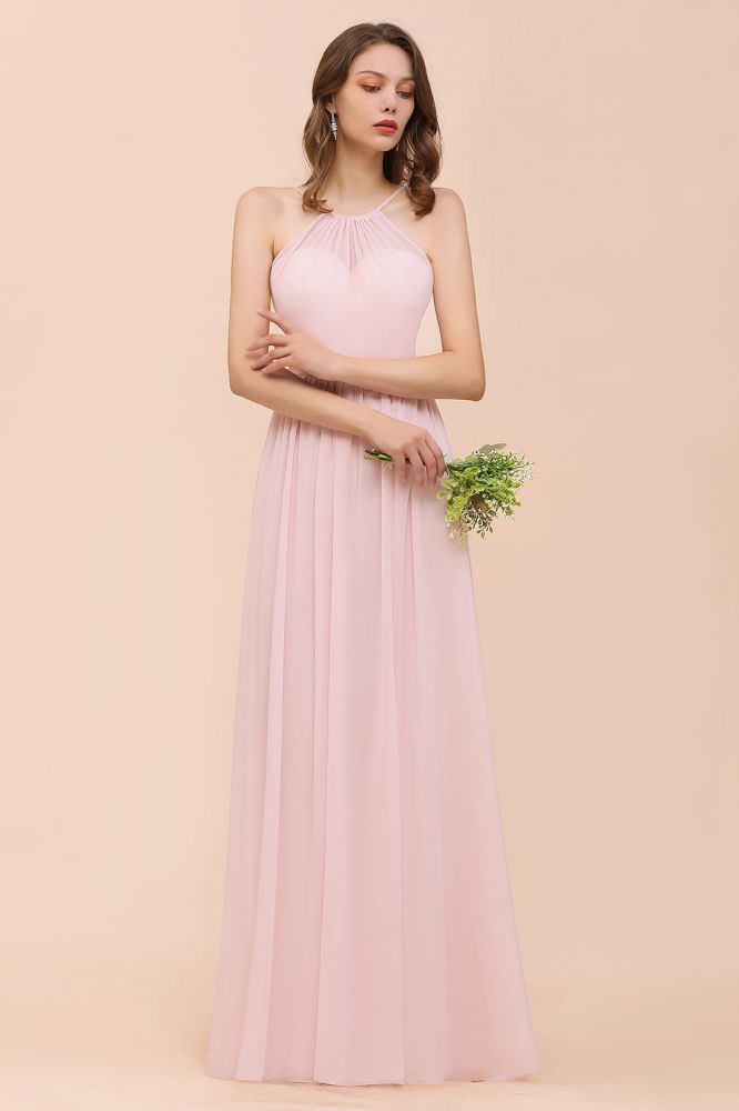 Pink Girls Bridesmaid Dress Halter Floor Length Chiffon Beach Wedding Party Dress