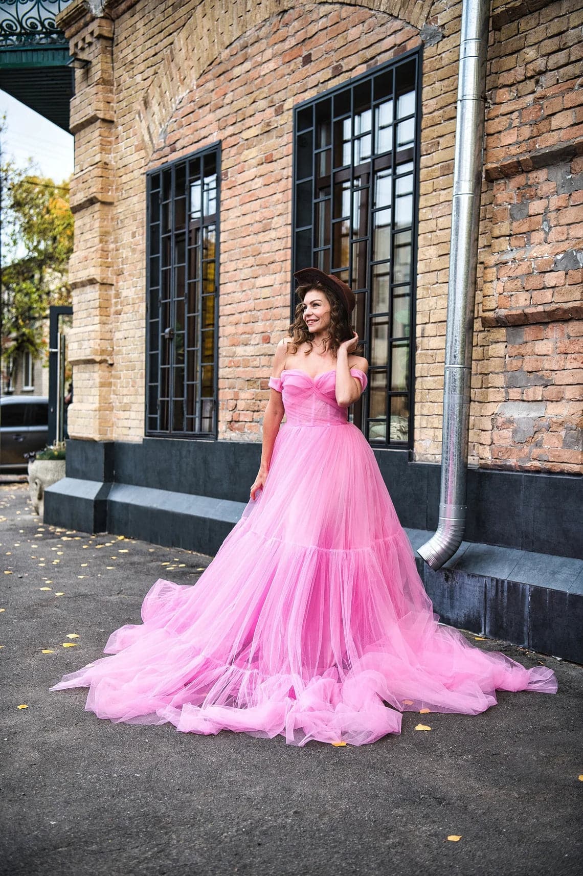 Exude elegance and charm in this fluffy women's off-the-shoulder photoshoot gown. Crafted with a V-neck ball gown design. this pink tulle gown is the epitome of sophistication. The tulle ruffles cascade down the length. adding an air of romance and grace. Perfect for prom or formal events. this long tulle ruffles prom dress is a vision of beauty. The ball gown silhouette accentuates your curves. creating a stunning formal evening dress that is sure to turn heads. Embrace your inner royalty and make a grand entrance in this exquisite women's ball gown evening dress. Upgrade your wardrobe with this pink tulle gown.
