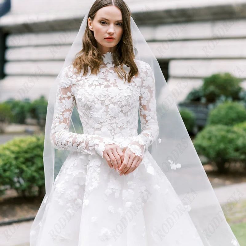 Princess Long Sleeve Wedding Dress For Women Romantic Lace High Neck Bride Party Gorgeous Applique Boho Bridal Gown