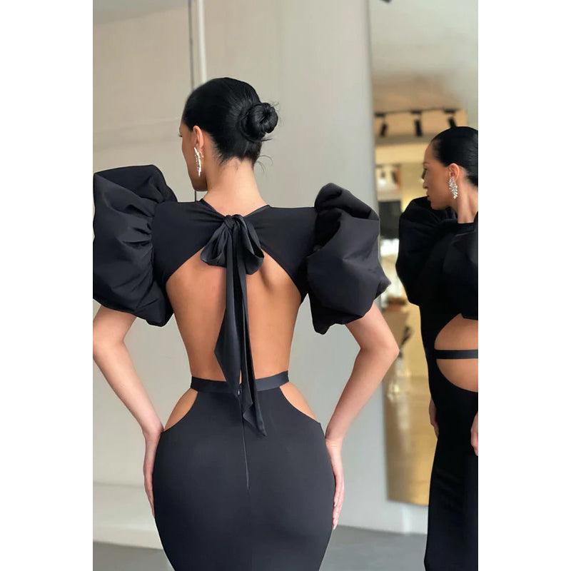 Round Neck Cut Outs Sheath Long Prom Evening Gown With Puff Sleeves
