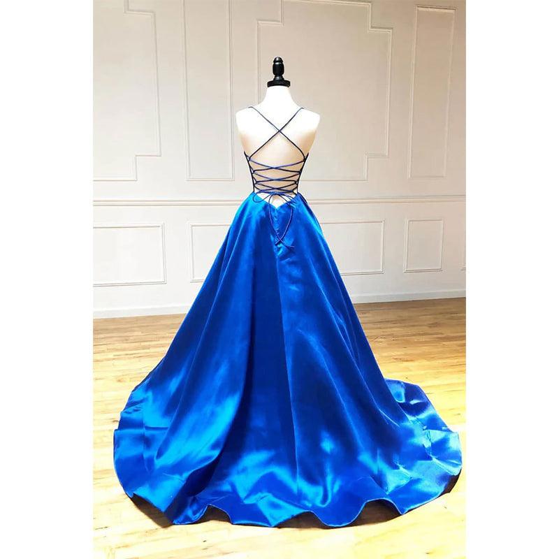 Royal Blue Satin V-neck Spaghetti Straps A-line Simple Prom Dress