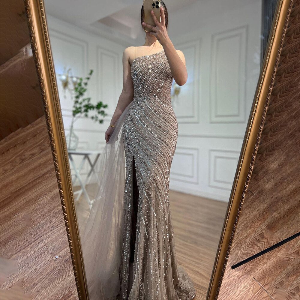 Seductive High Split Beaded Mermaid Evening Gown with One-Shoulder With Overskirt in Caramel Color for Women Party LA71371A