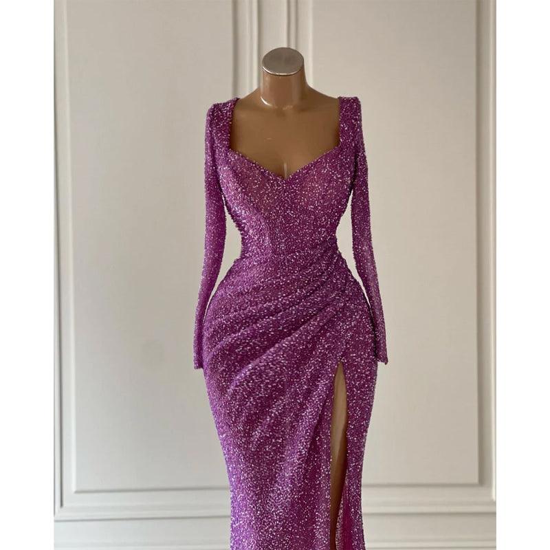 Sequins V-Neck Long Sleeve Ruched Side Slit Sheath Formal Prom Dress