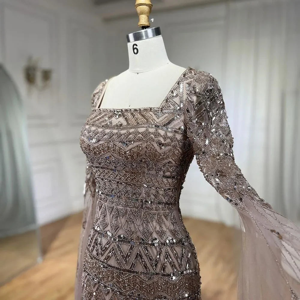 The intricate scalloped design and stunning overskirt add a touch of glamour to this high slit gown. perfect for any formal occasion. Immerse yourself in the rich culture of Dubai with this exquisite Arabic-inspired dress.