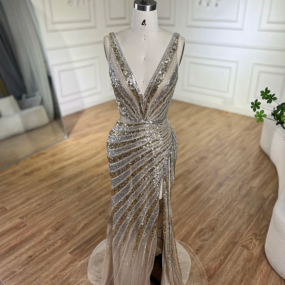 2025 Gold Mermaid Spaghetti Strap Side Split Beaded Luxury Evening Dresses Gowns for Women Wedding Party LA72613