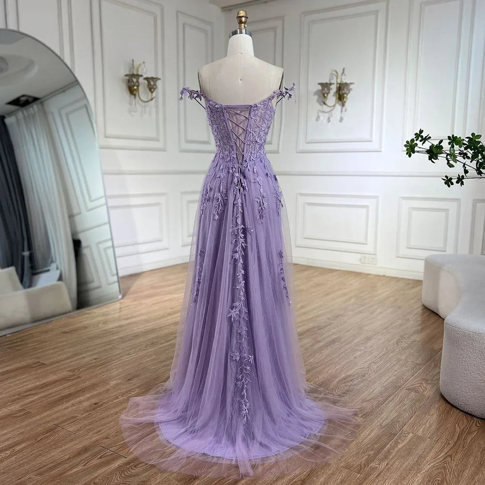 2025 Lilac Spaghetti Strap Lace-Up Back A-Line Appliqué Prom Dress for Women | Wedding Party LA72620