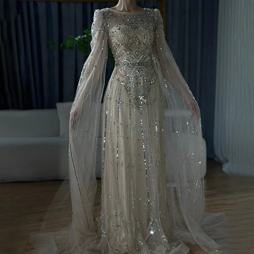 2025 Luxury Dubai Blue Cape Sleeves Alina Beaded Stone Arabic Evening Gowns for Women Wedding Party LA72635