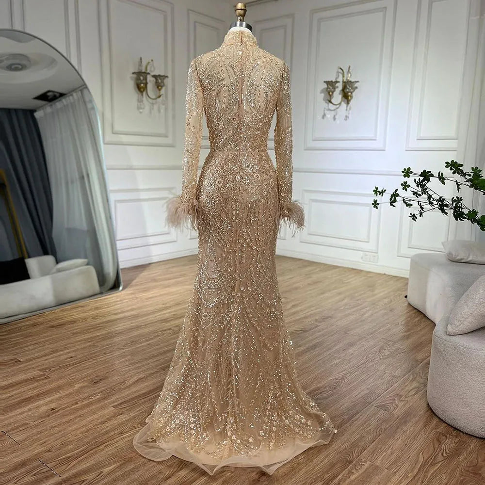 2025 Muslim Women Wedding Party Dubai Gowns Gold Luxury Beaded Feathers Mermaid Long Evening Dresses LA72546