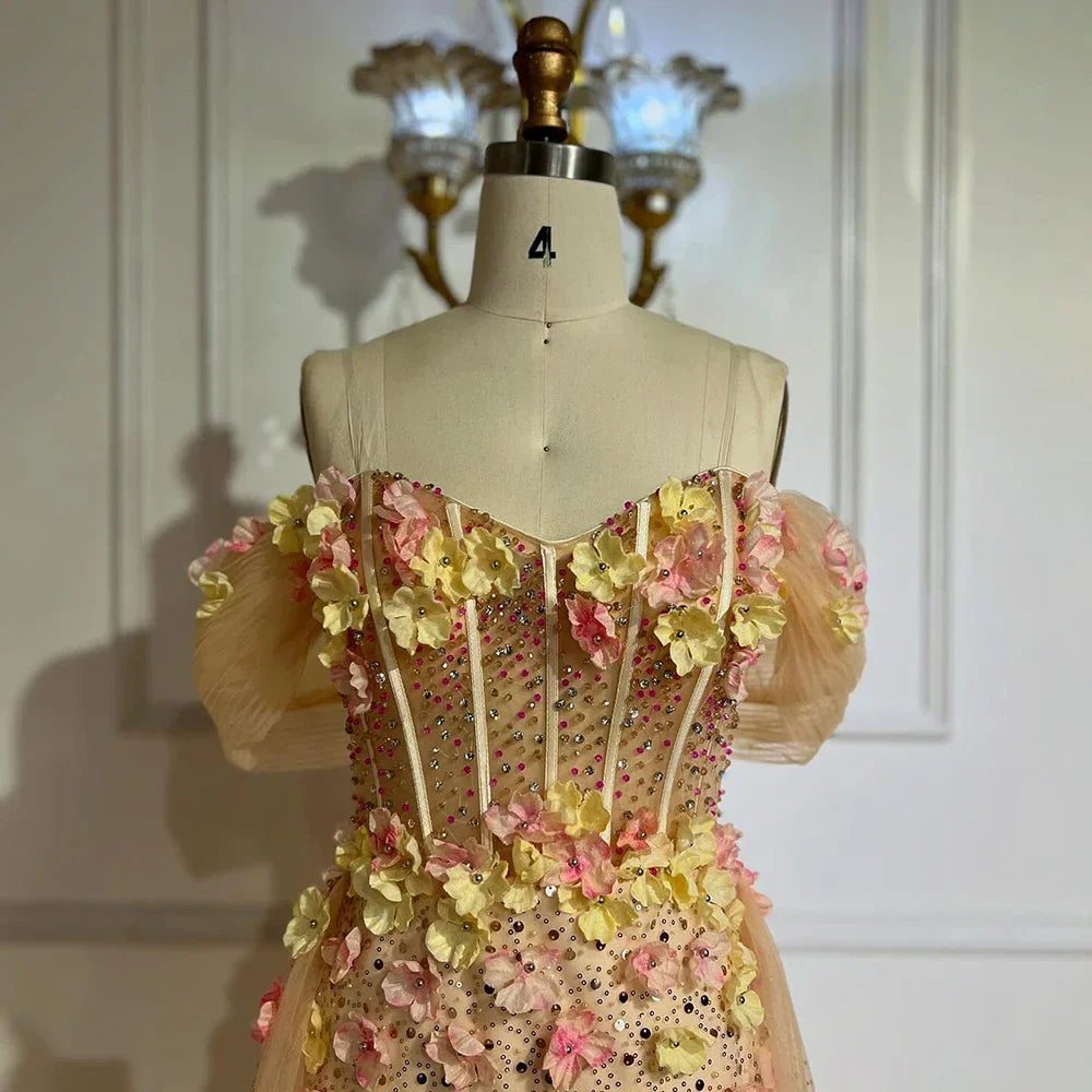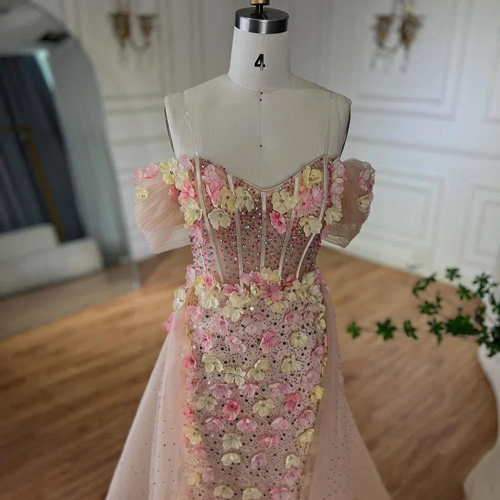 2025 Nude Floral Beaded Off Shoulder Corset Evening Gown With Overskirt for Formal Occasion LA72861