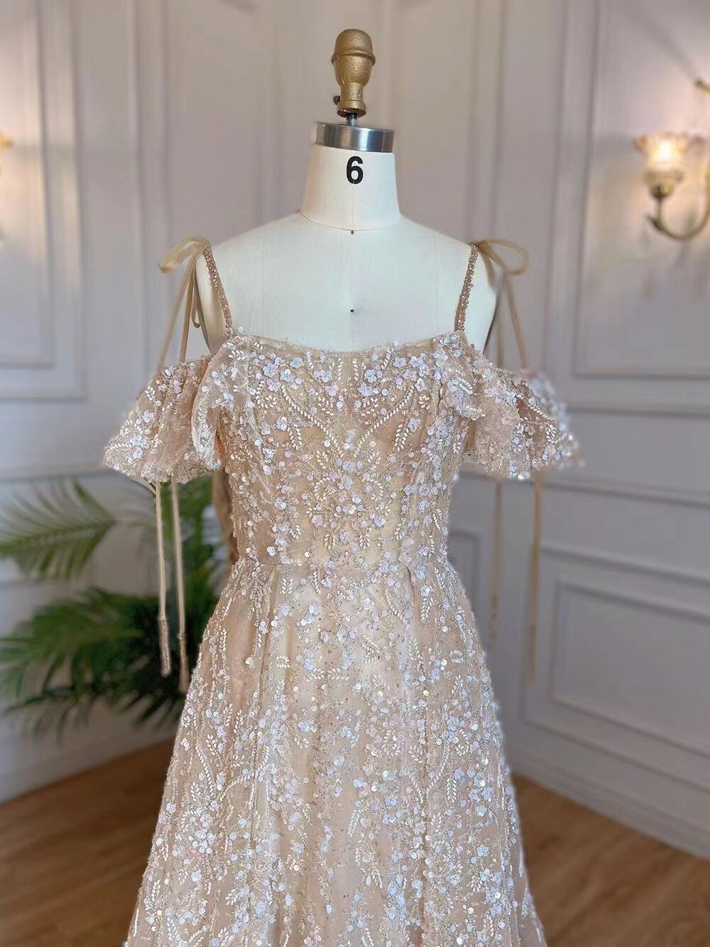 Arabic A-Line Nude Sexy Spaghetti Straps Lace Up Beaded Dubai Evening Dresses Gowns 2025 For Women Party LA71871