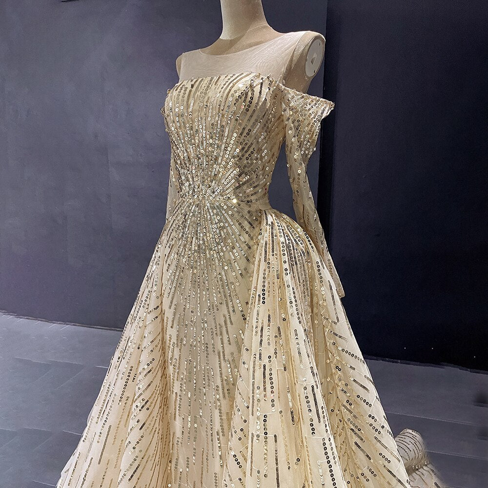 Advanced Customization Gold Mermaid Elegant Sparkle Evening Dresses Long Sleeves With Skirt Not Removable LA71695