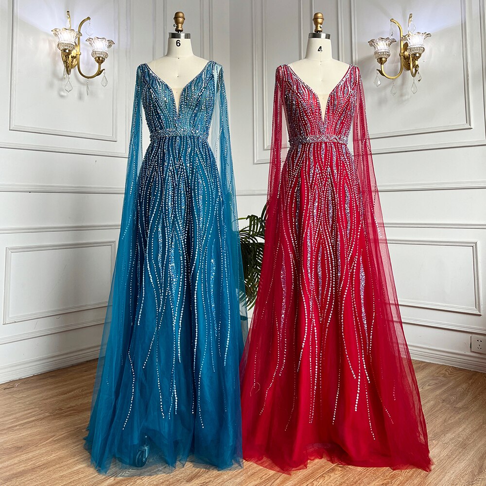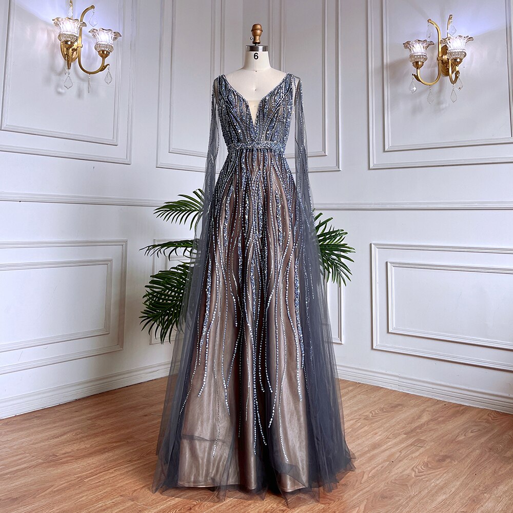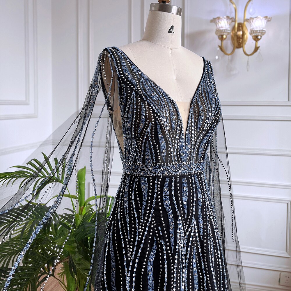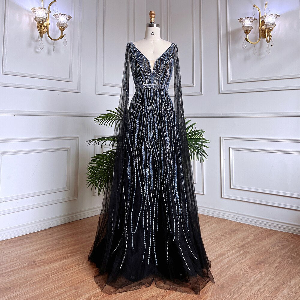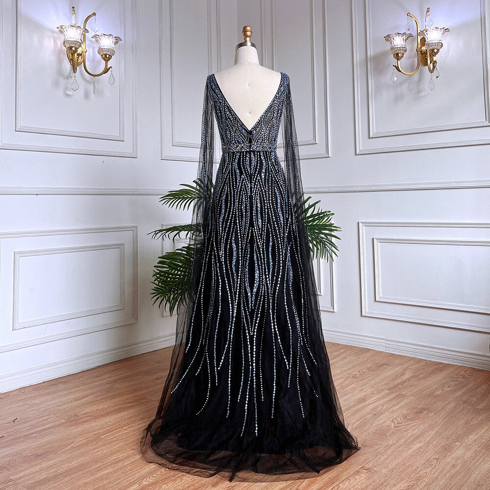 Arabic Black A Line Cape Sleeves V Neck Beaded Long Evening Dresses Gowns For Women Wedding Party 2025 LA71960