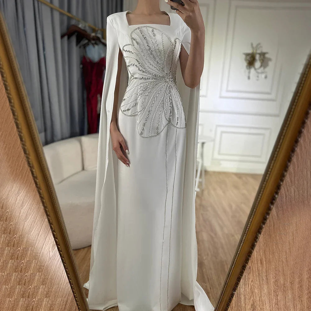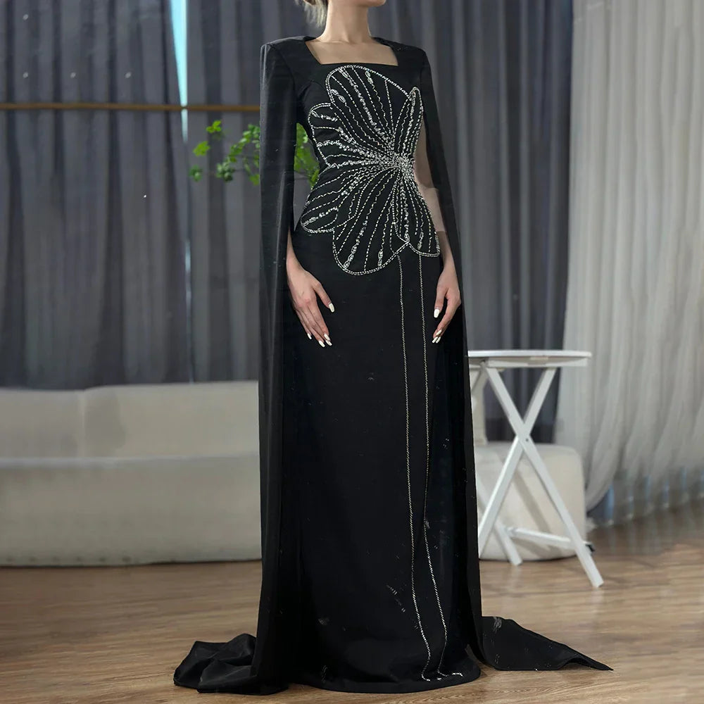 Arabic Black Mermaid Elegant Cape Sleeves Beaded Satin Luxury Dubai Evening Dresses Gowns For Women Party LA72461