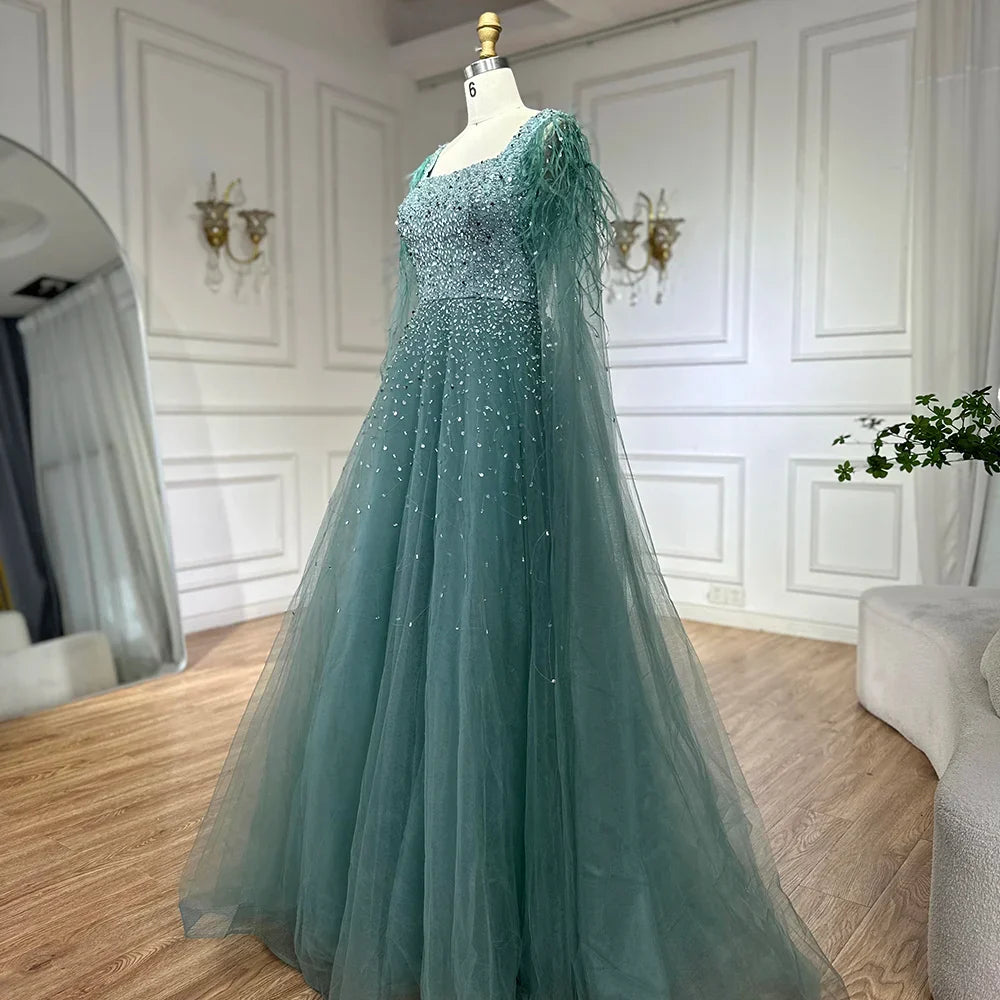 Arabic Blue A Line Feathers Cape Sleeves Beaded Luxury Saudi Evening Dresses Gowns for Formal Occasion 2025 LA71782A