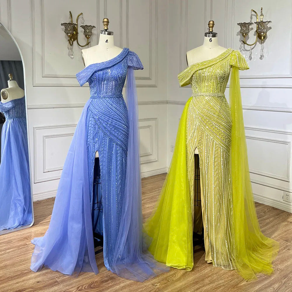 Arabic Blue One-Shoulder Yellow High-Split Mermaid Beaded Evening Gown for Women | Wedding Party 2025 LA72596